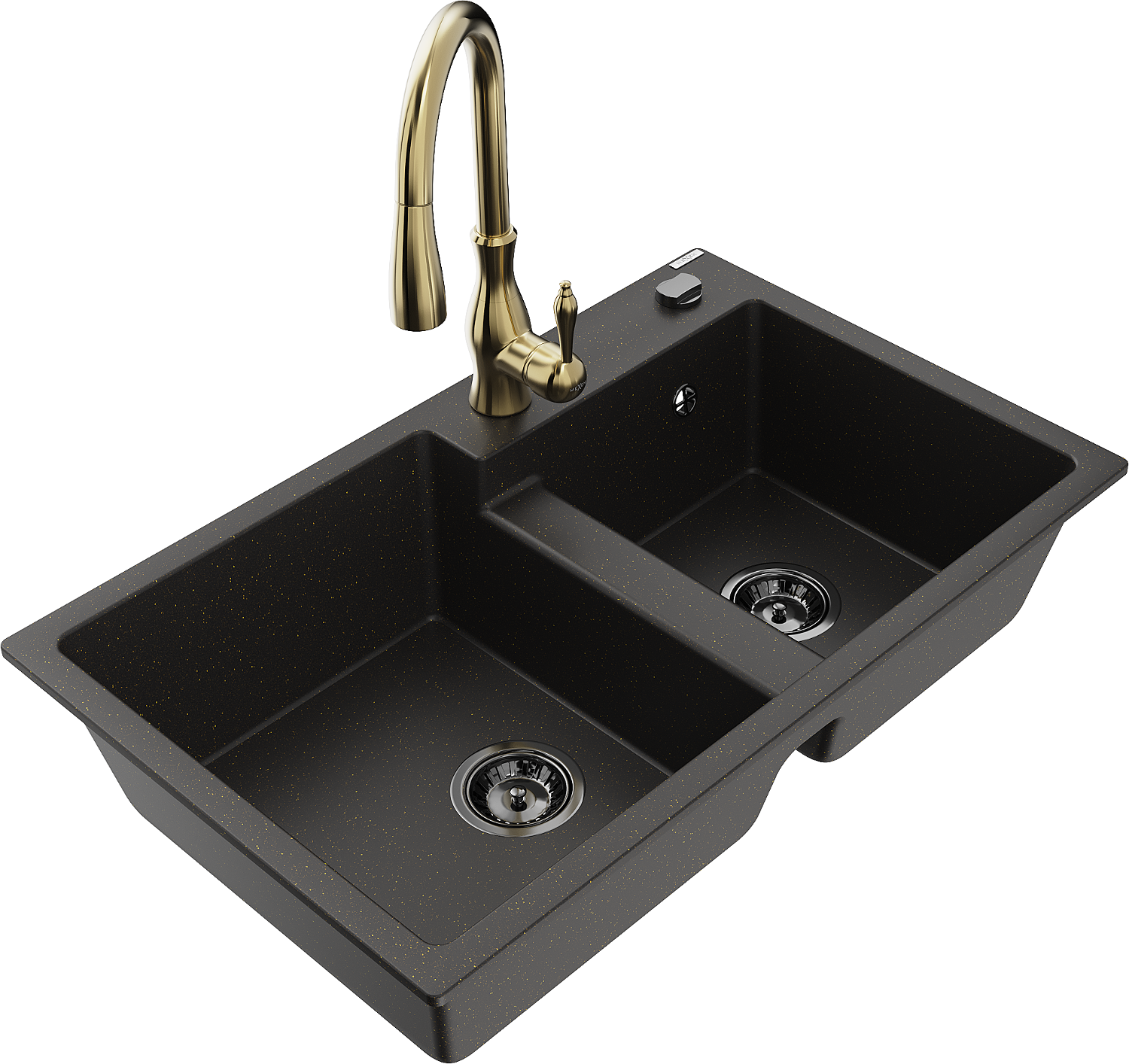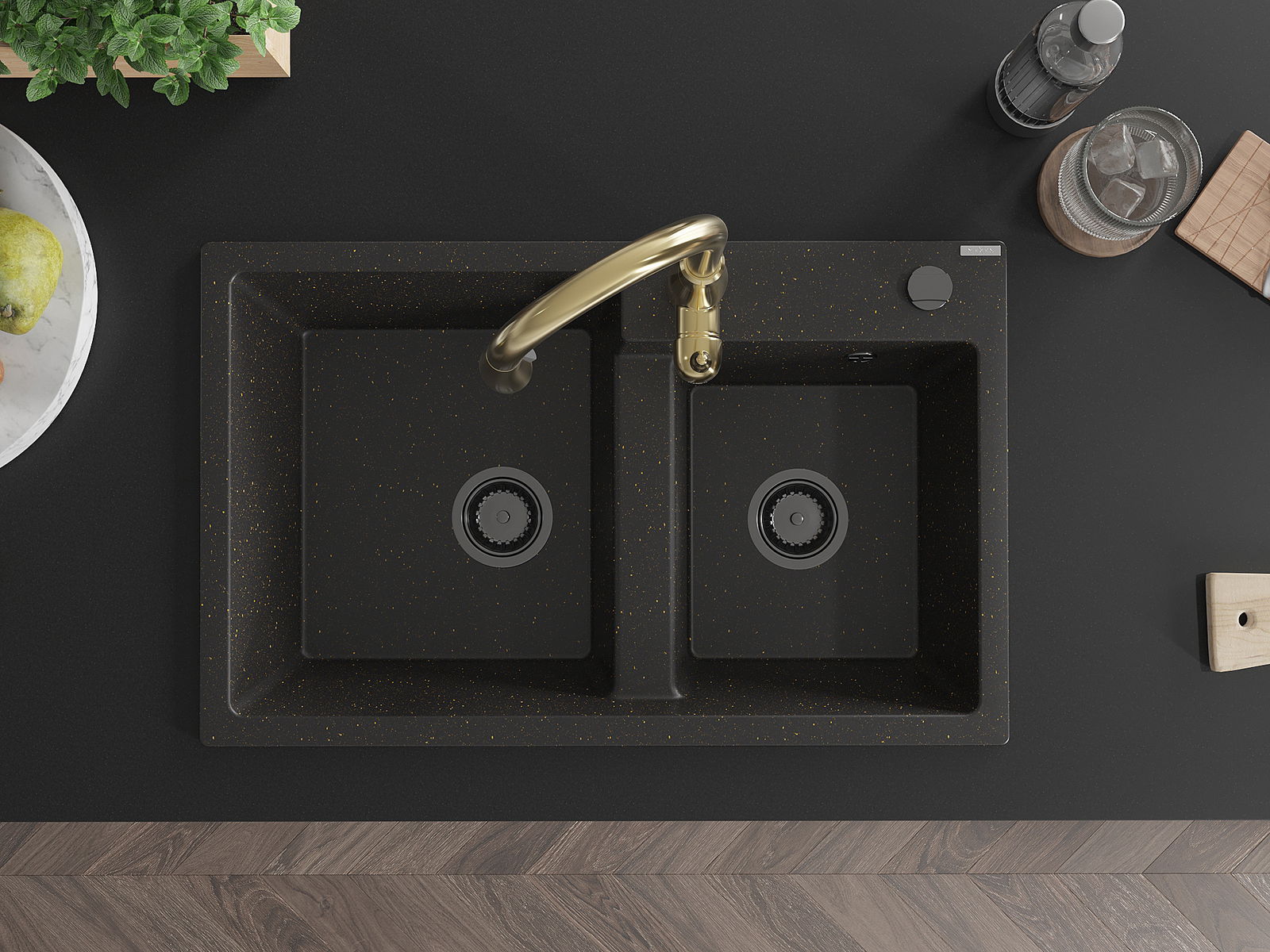 Mexen Tomas fregadero de granito de 2 senos con grifo de cocina Savita, negro/oro metálico - 6516-75-672601-50-B