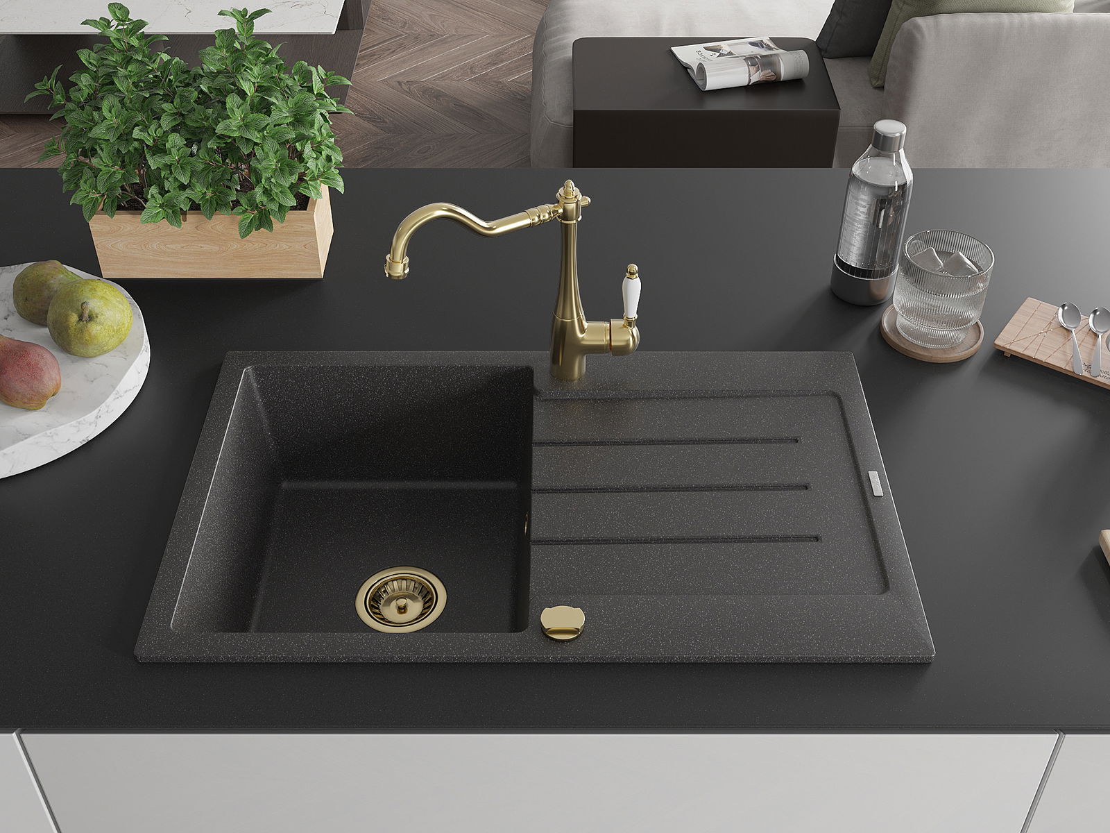 El fregadero está hecho de granito de alta calidad. Constituye un complemento elegante y, sobre todo, práctico para cualquier cocina, independientemente de su estilo. La alta calidad y durabilidad del granito aseguran un uso durante muchos años.