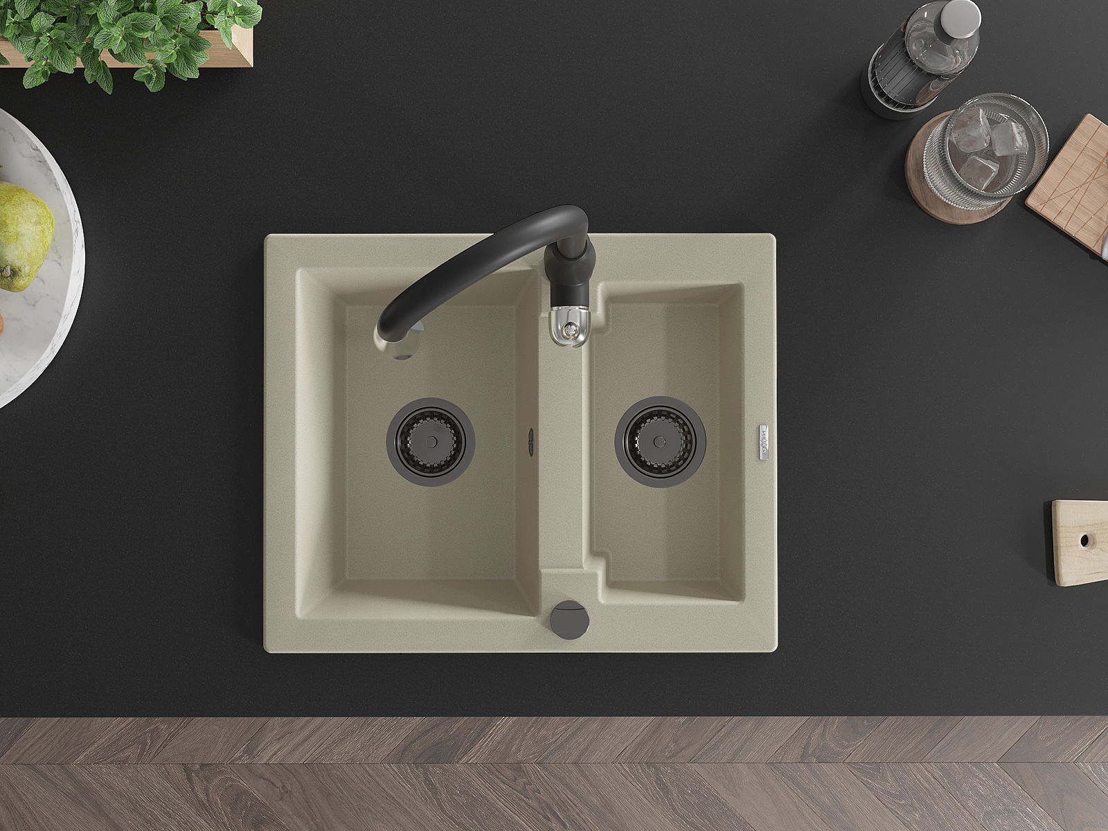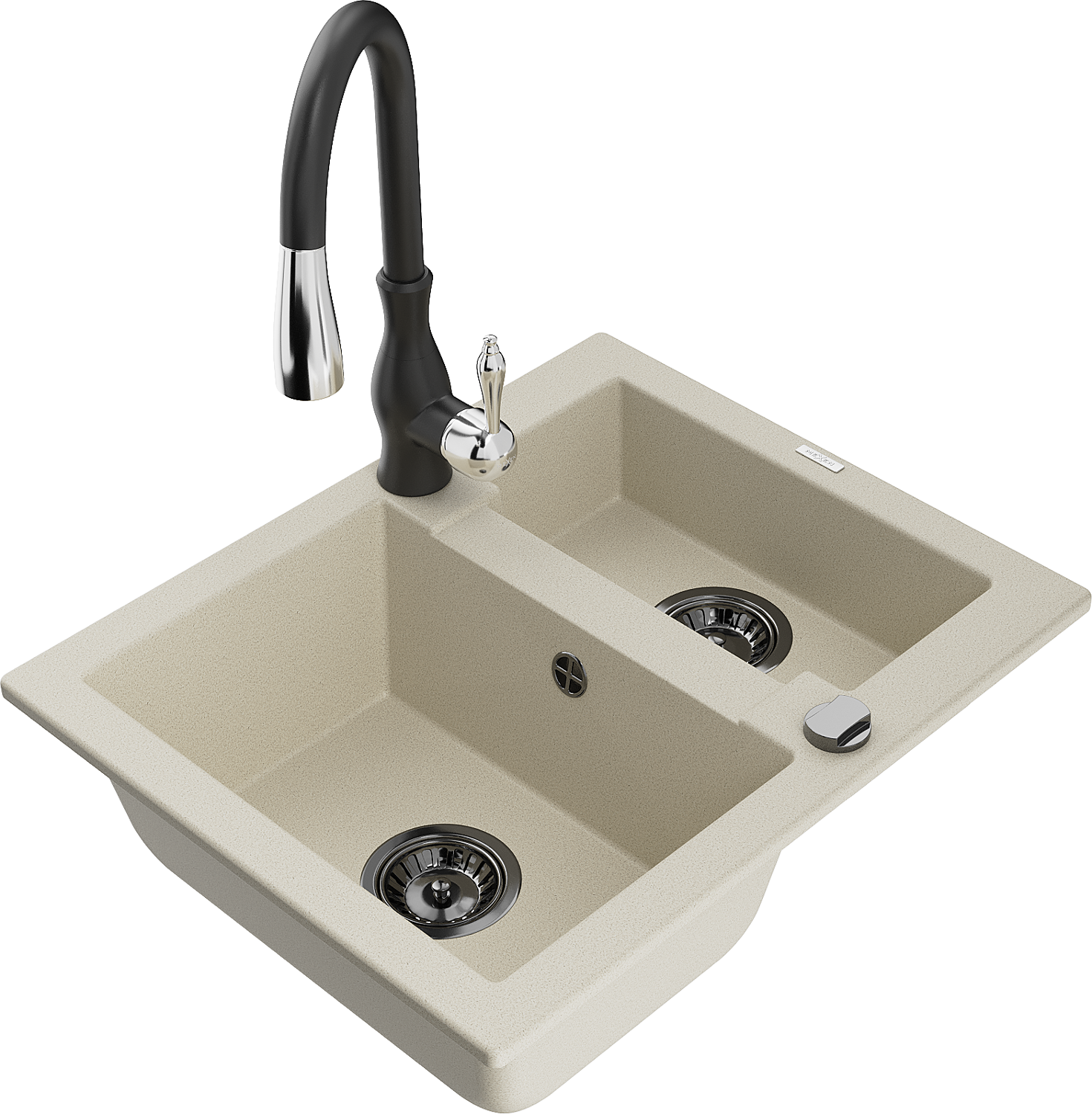 Mexen Carlos fregadero de granito 1,5-cubetas con grifo de cocina Savita, beige - 6518-69-672601-70