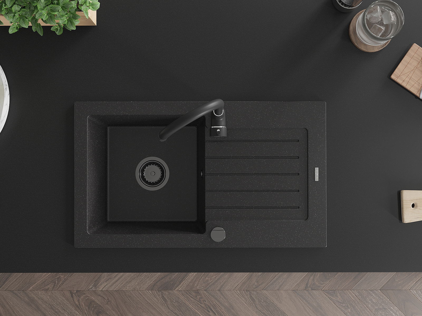 El fregadero está hecho de granito de alta calidad. Es un complemento elegante y, sobre todo, práctico para cualquier cocina, independientemente de su estilo. La alta calidad y durabilidad del granito aseguran un uso prolongado durante años.