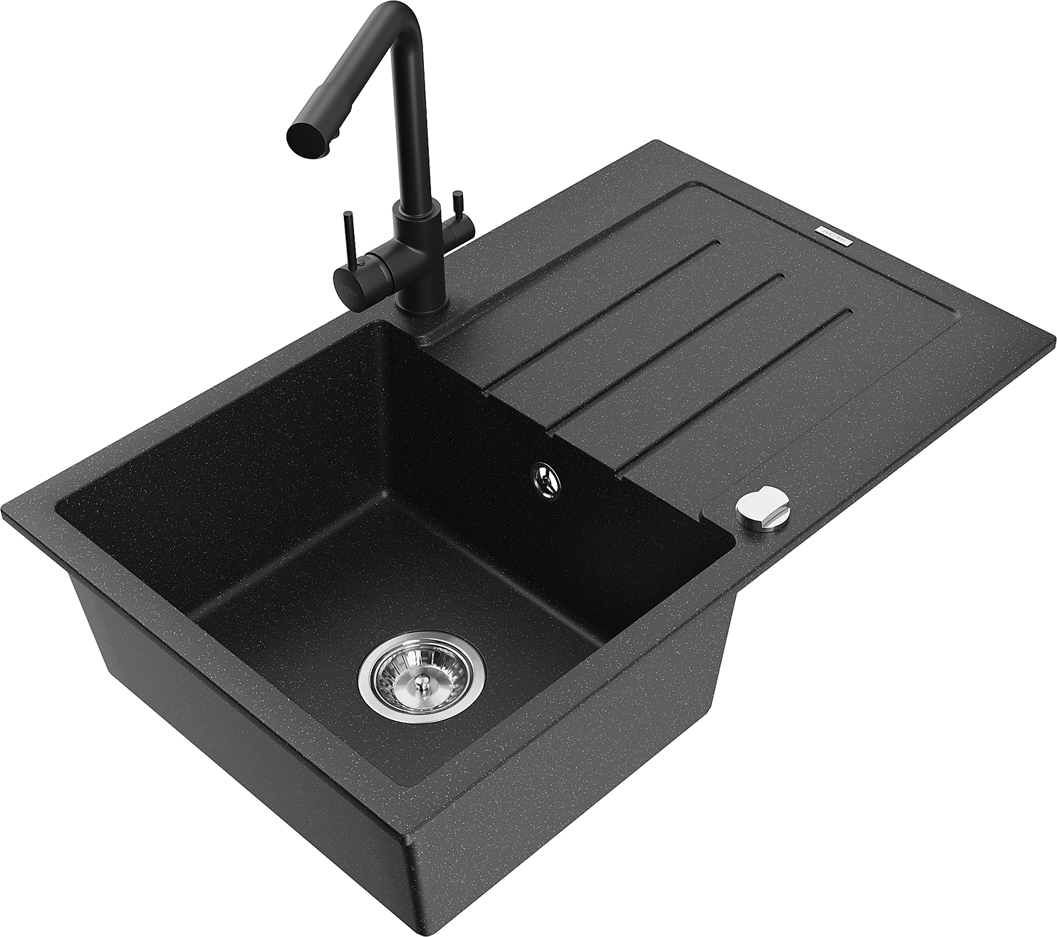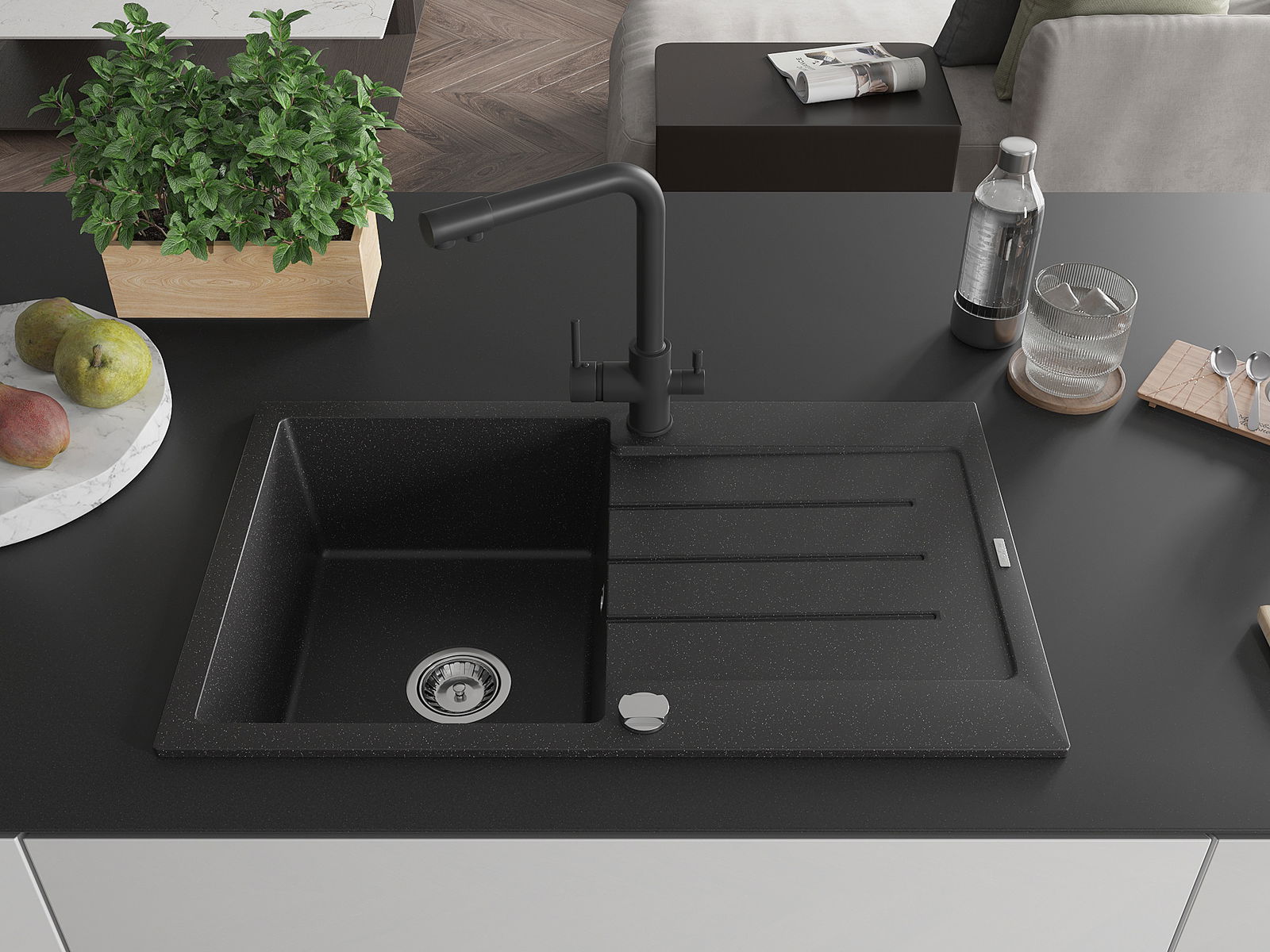El fregadero está hecho de granito de alta calidad. Es un complemento elegante y, sobre todo, práctico para cualquier cocina, independientemente de su estilo. La alta calidad y durabilidad del granito aseguran un uso prolongado durante años.