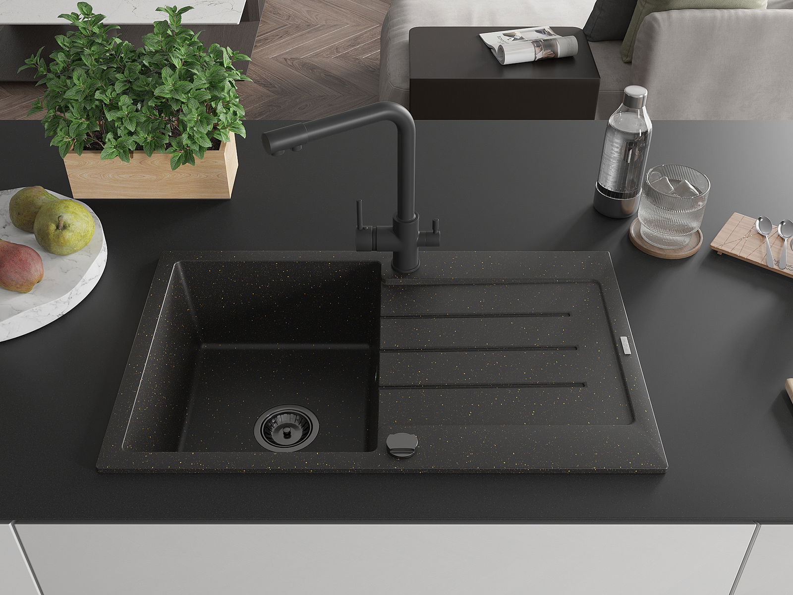 El fregadero está hecho de granito de alta calidad. Constituye un complemento elegante y, sobre todo, práctico para cualquier cocina, independientemente de su estilo. La alta calidad y durabilidad del granito aseguran un uso durante muchos años.