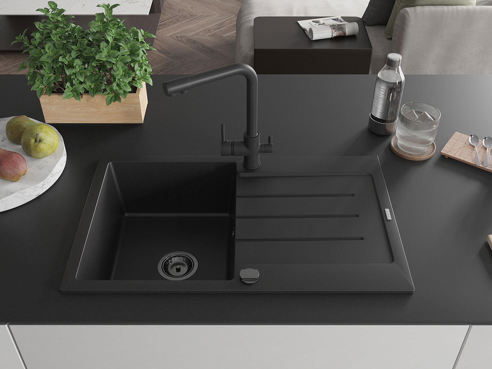 El fregadero está hecho de granito de alta calidad. Constituye un complemento elegante y, sobre todo, práctico para cualquier cocina, independientemente de su estilo. La alta calidad y durabilidad del granito aseguran un uso durante muchos años.