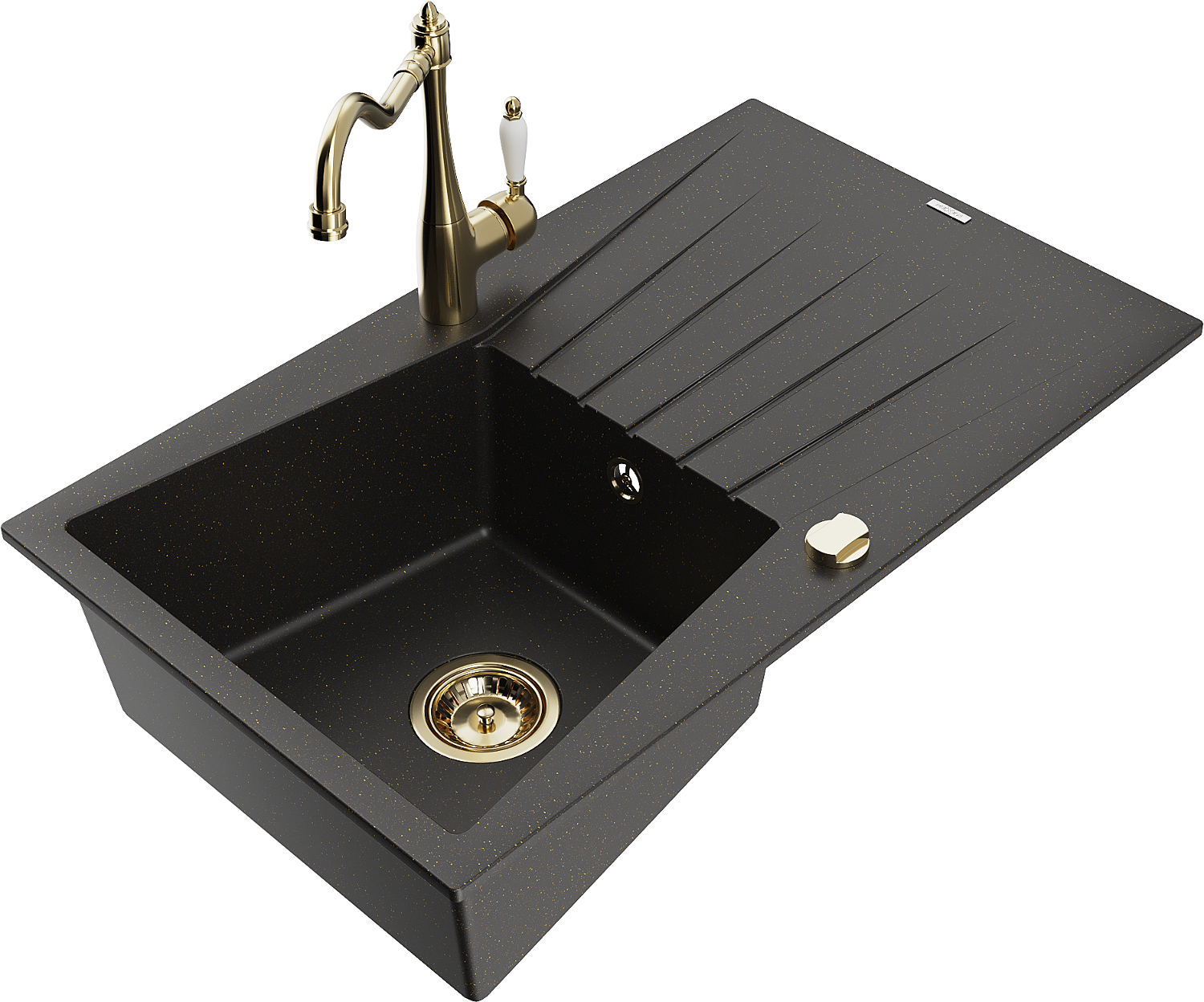 Mexen Cesar fregadero de granito de 1 cubeta con escurridor y grifo de cocina Carla, negro/dorado metálico - 6514-75-670700-50