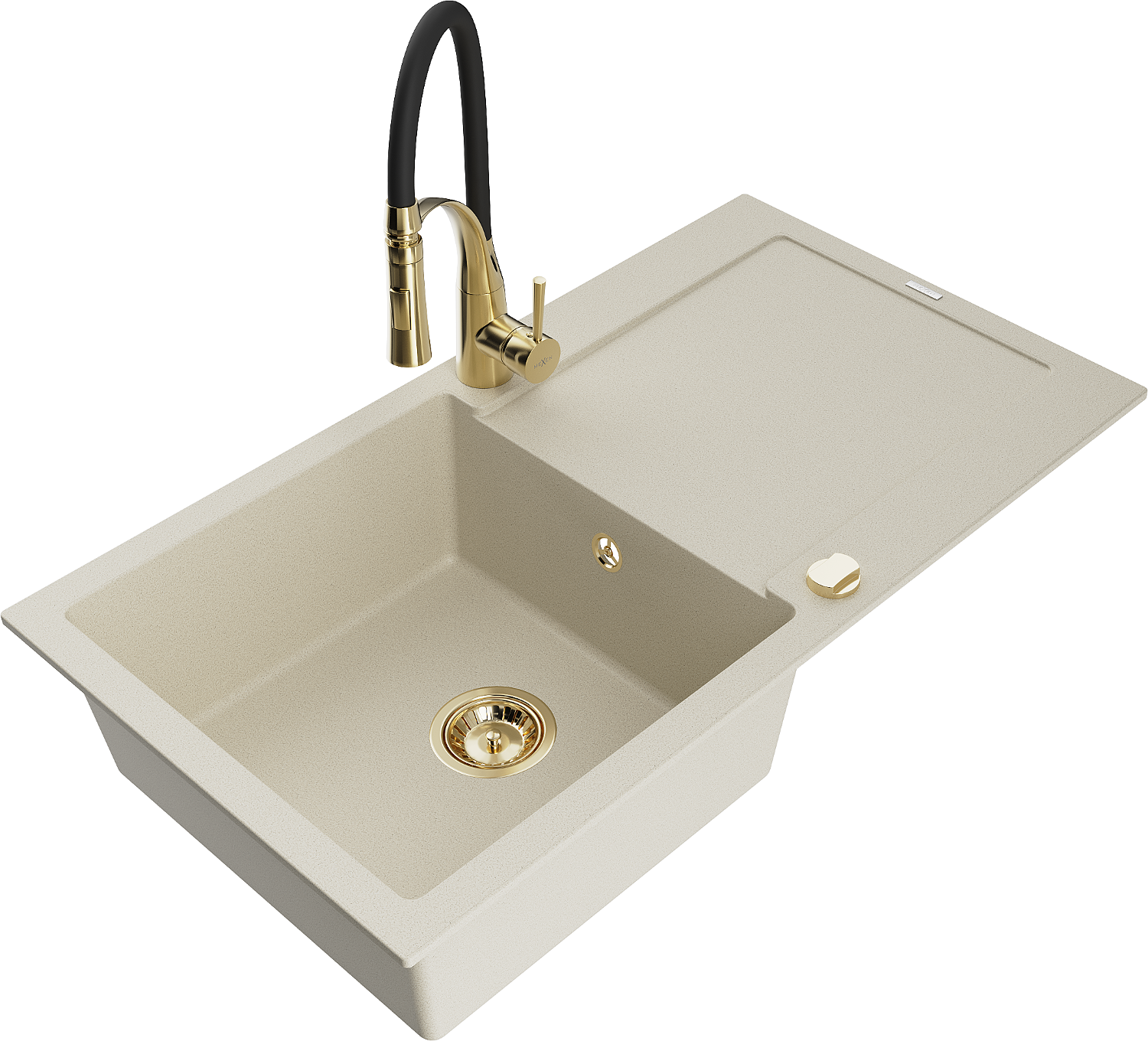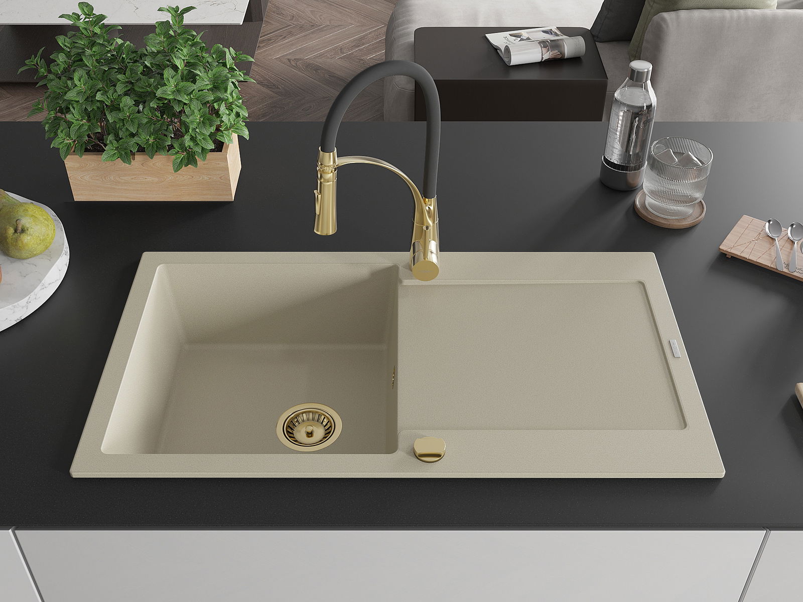 Mexen Leo fregadero de granito de 1 compartimento con escurridor y grifo de cocina Aster, beige - 6501-69-73450-57-G
