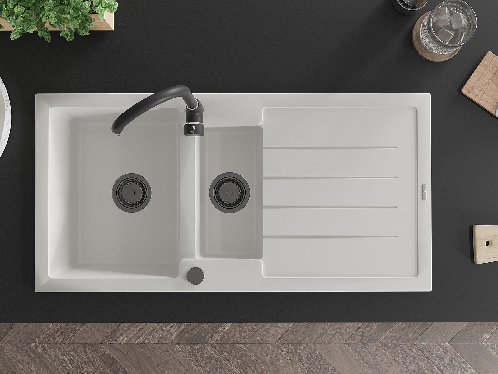 El fregadero está hecho de granito de alta calidad. Es un complemento elegante y, sobre todo, práctico para cualquier cocina, independientemente de su estilo. La alta calidad y durabilidad del granito aseguran un uso prolongado durante años.