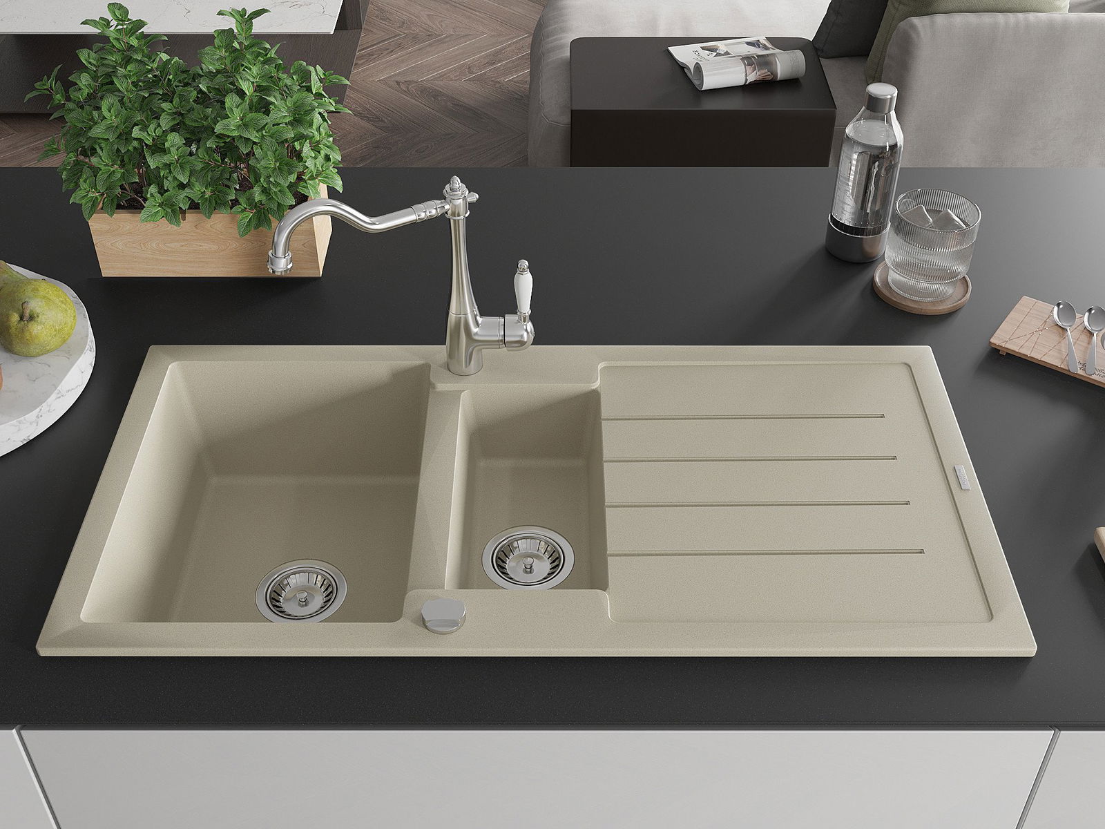 El fregadero está hecho de granito de alta calidad. Constituye un complemento elegante y, sobre todo, práctico para cualquier cocina, independientemente de su estilo. La alta calidad y durabilidad del granito aseguran un uso durante muchos años.