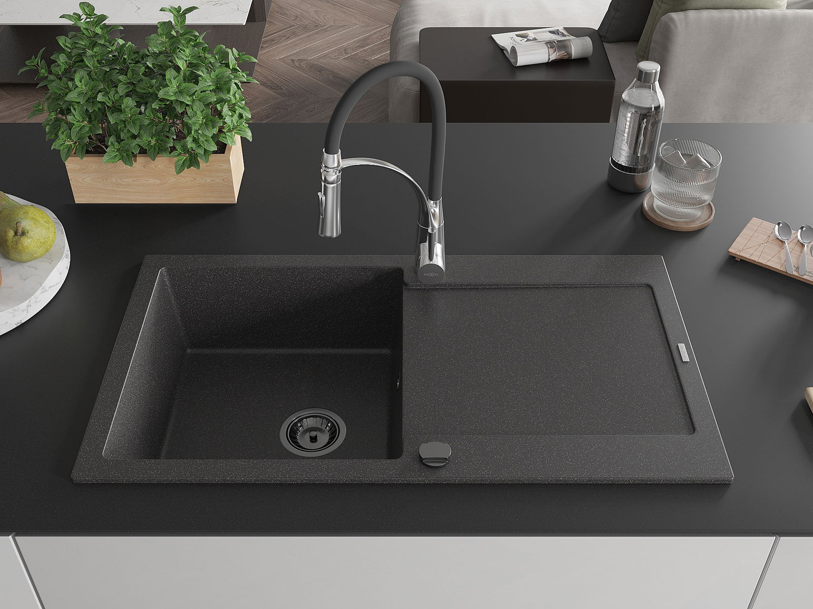 El fregadero está hecho de granito de alta calidad. Constituye un complemento elegante y, sobre todo, práctico para cualquier cocina, independientemente de su estilo. La alta calidad y durabilidad del granito aseguran un uso durante muchos años.