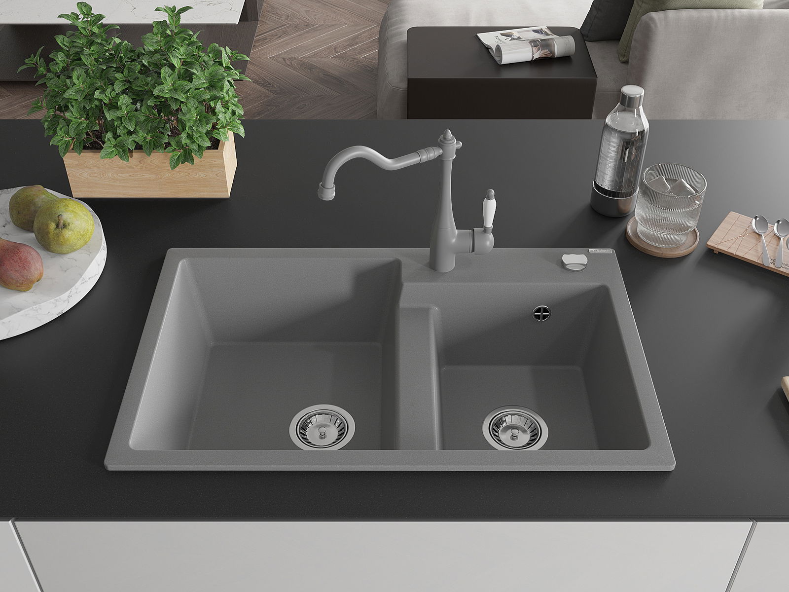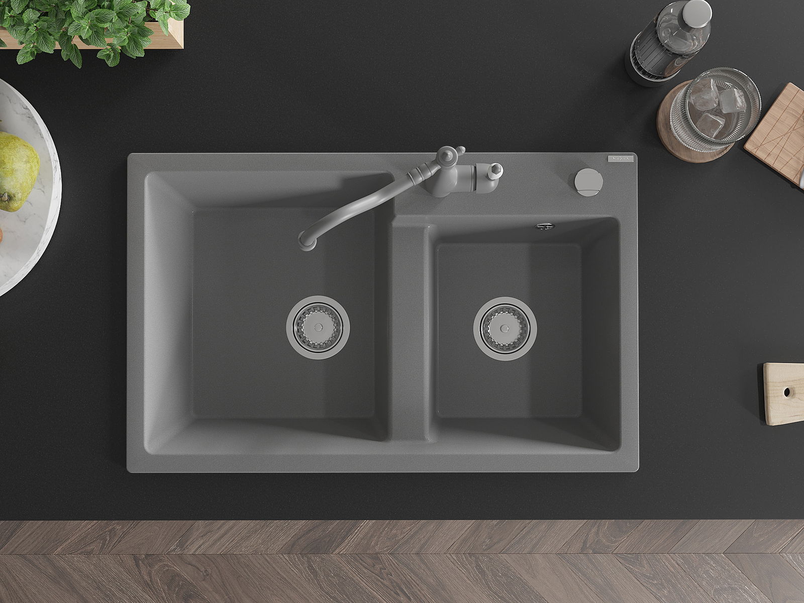 Mexen Tomas fregadero de granito de 2 compartimentos con grifo de cocina Carla, gris - 6516-71-670700-71