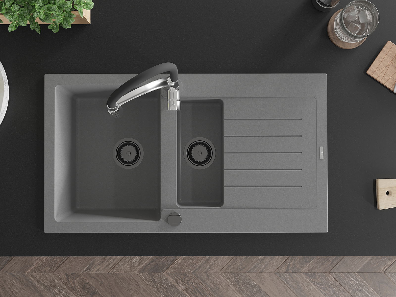 El fregadero está hecho de granito de alta calidad. Es un complemento elegante y, sobre todo, práctico para cualquier cocina, independientemente de su estilo. La alta calidad y durabilidad del granito aseguran un uso prolongado durante años.