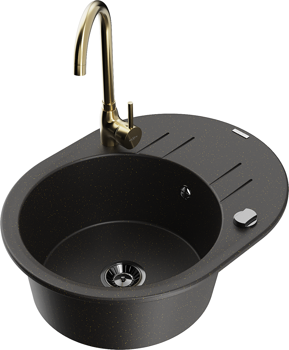 Mexen Kevin fregadero de granito de 1 cubeta con escurridor y grifo de cocina Telma, negro/oro metálico - 6517-75-670200-50-B