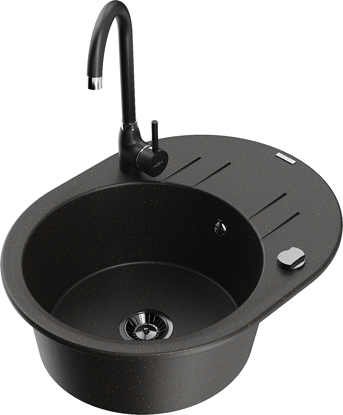 Mexen Kevin fregadero de granito de 1 cubeta con escurridor y grifo de cocina Telma, negro/dorado metálico