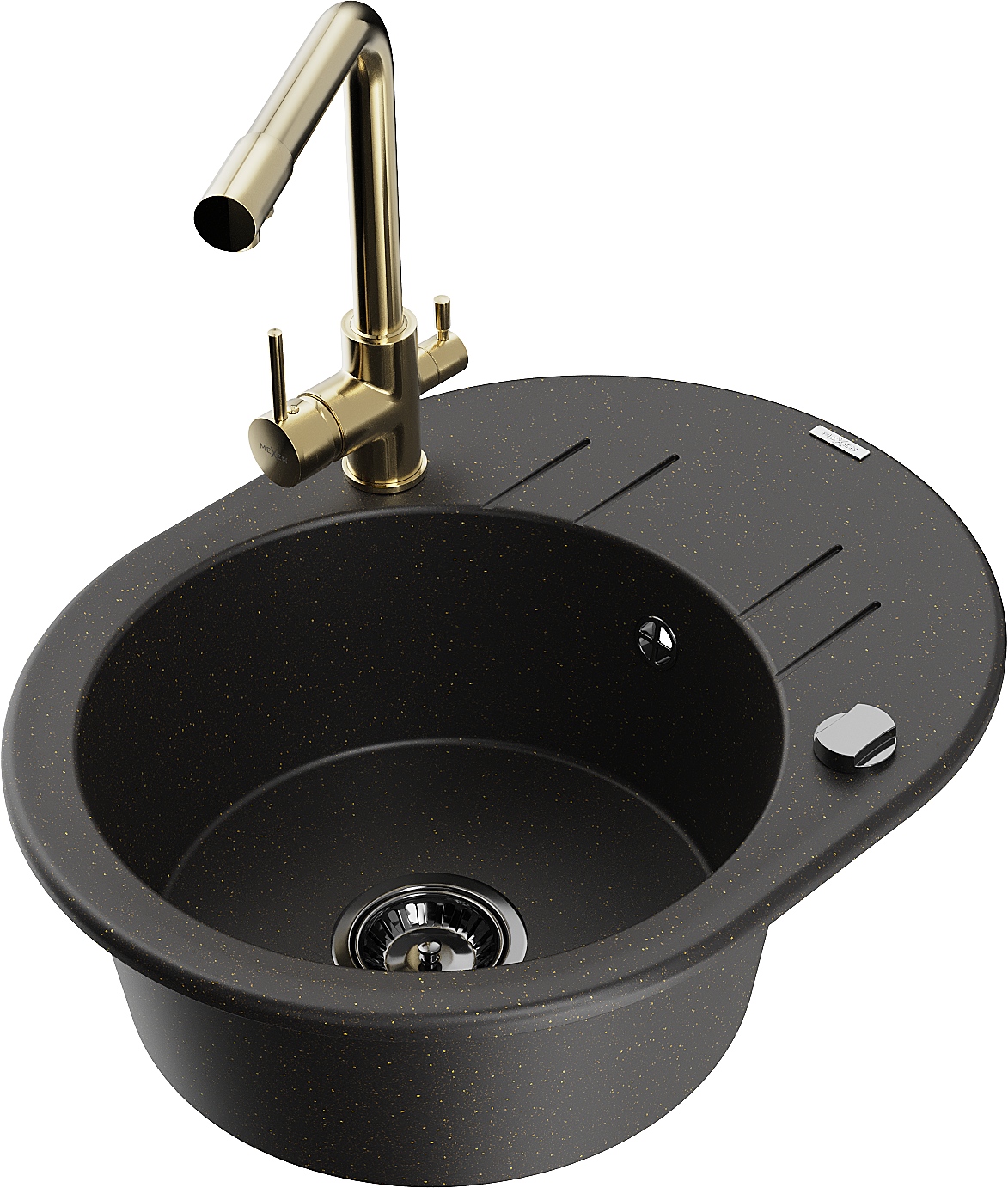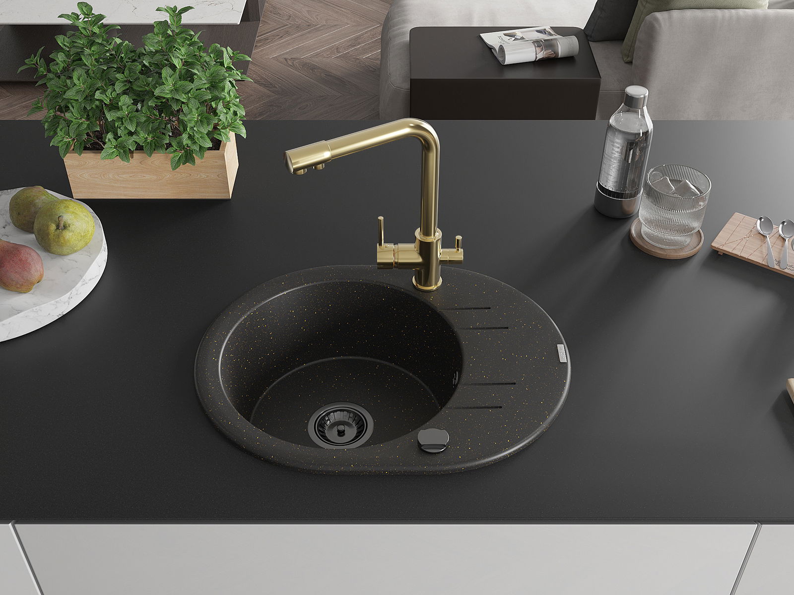 Mexen Kevin fregadero de granito de 1 cubeta con escurridor y grifo de cocina Duero, negro/oro metálico - 6517-75-671600-50-B