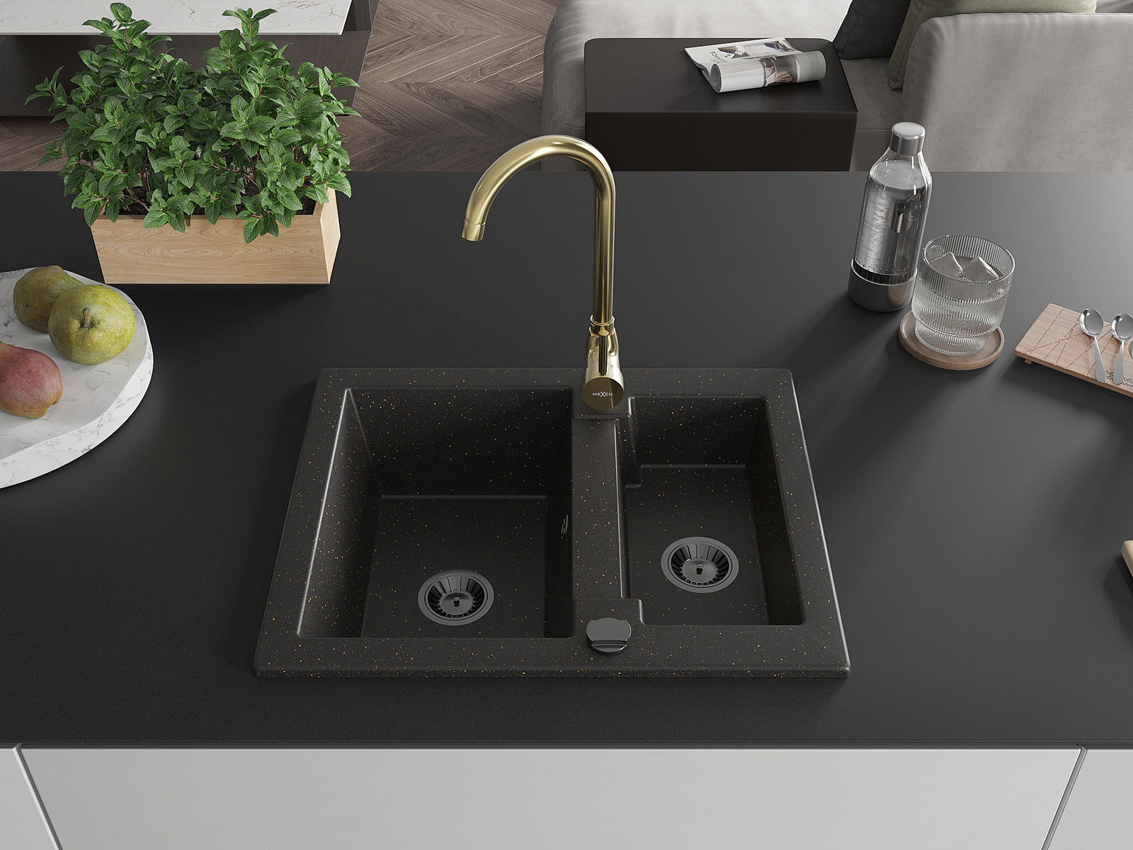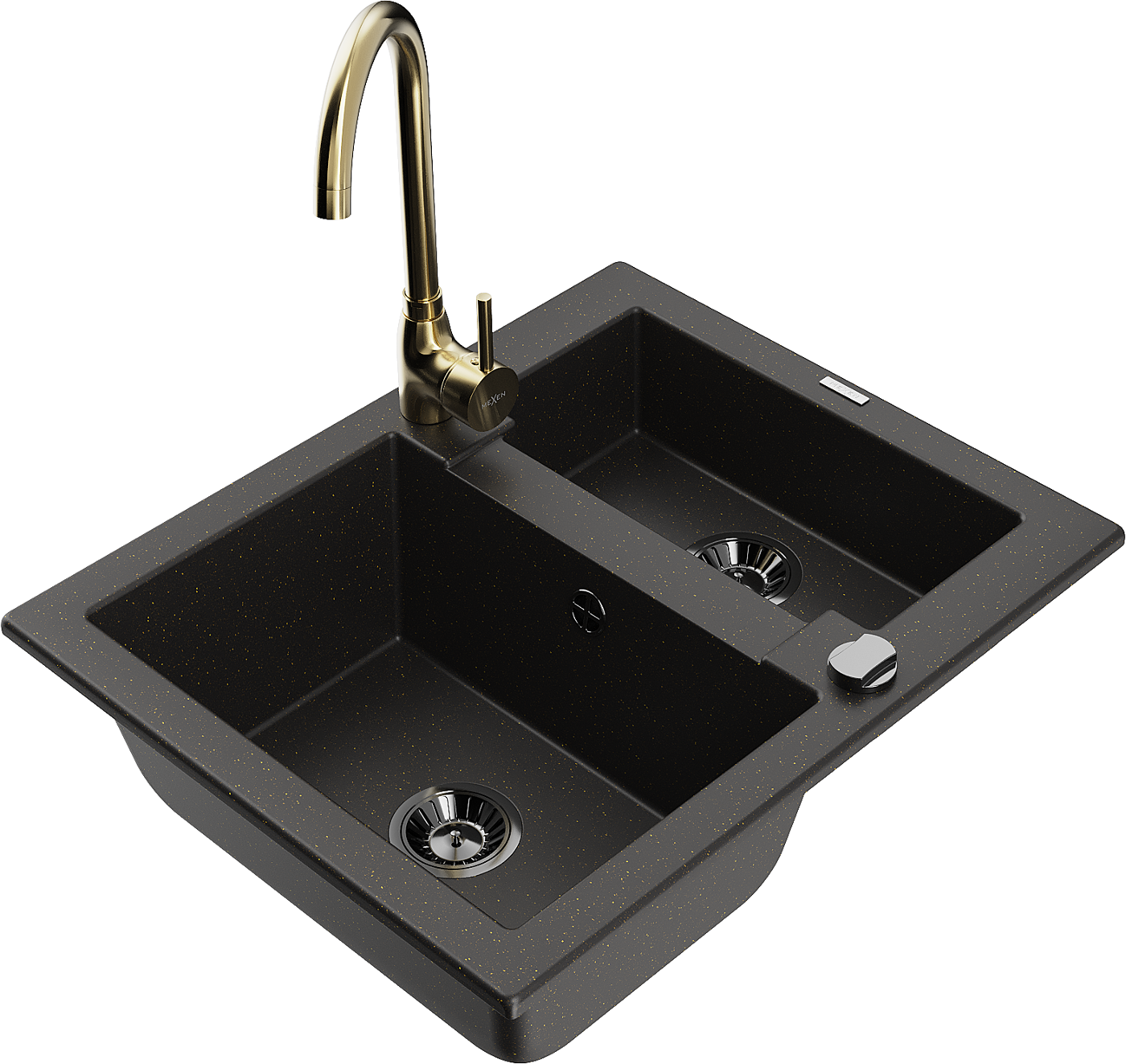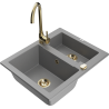 Mexen Carlos fregadero de granito de 1,5 senos con grifo de cocina Telma, negro/metalizado dorado - 6518-75-670200-50-B