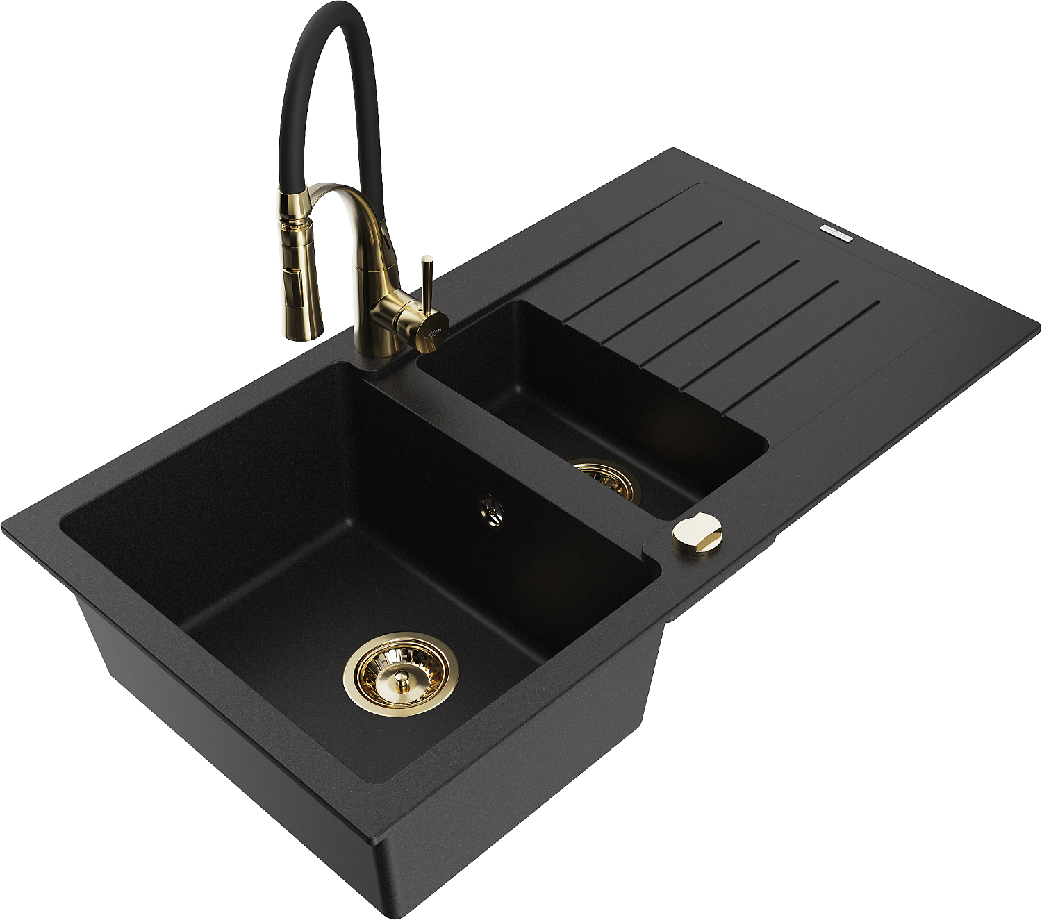 Mexen Matias fregadero de granito de 1,5 senos con escurridor y grifo de cocina Aster, negro - 6502-77-73450-57-G