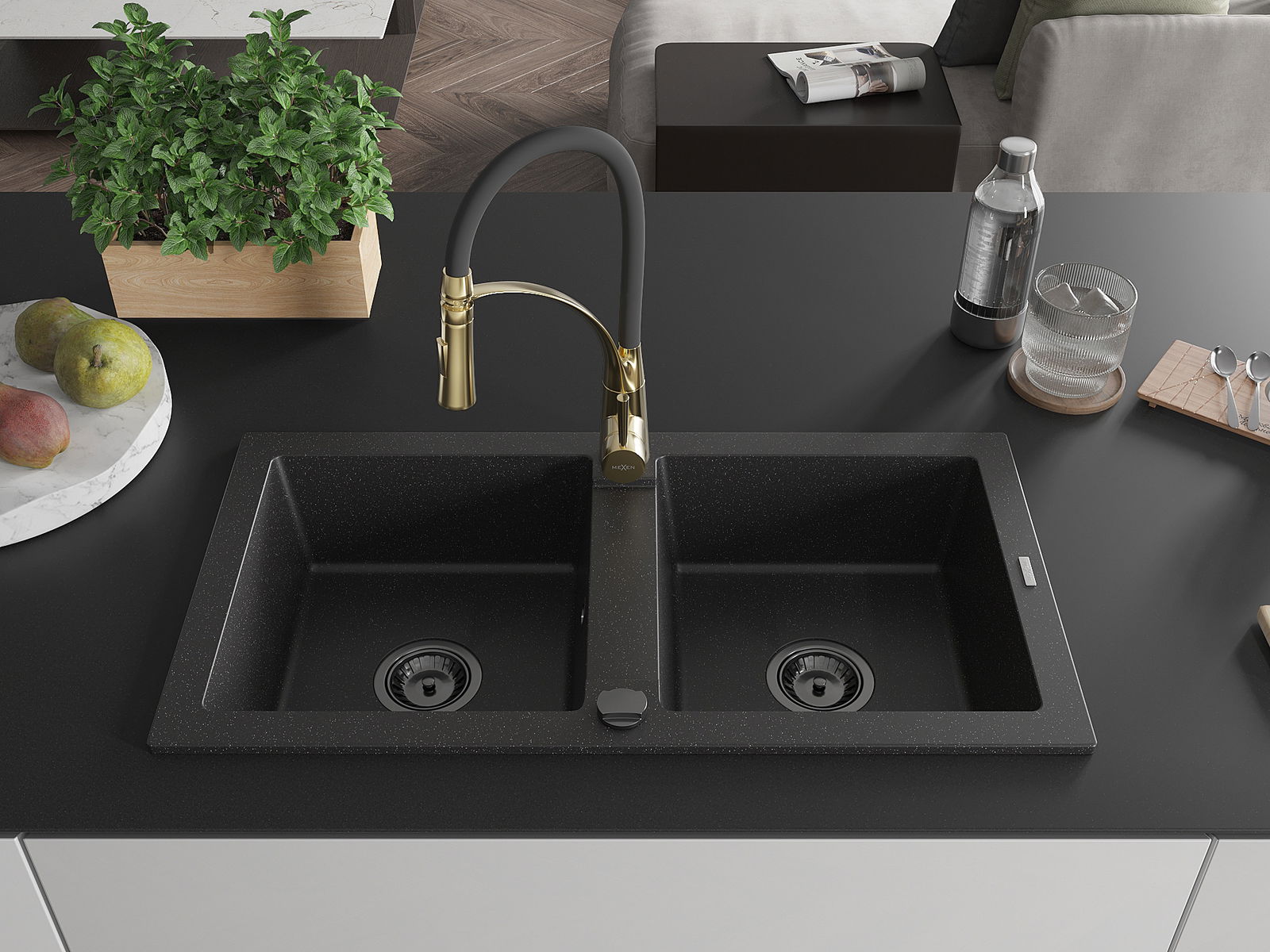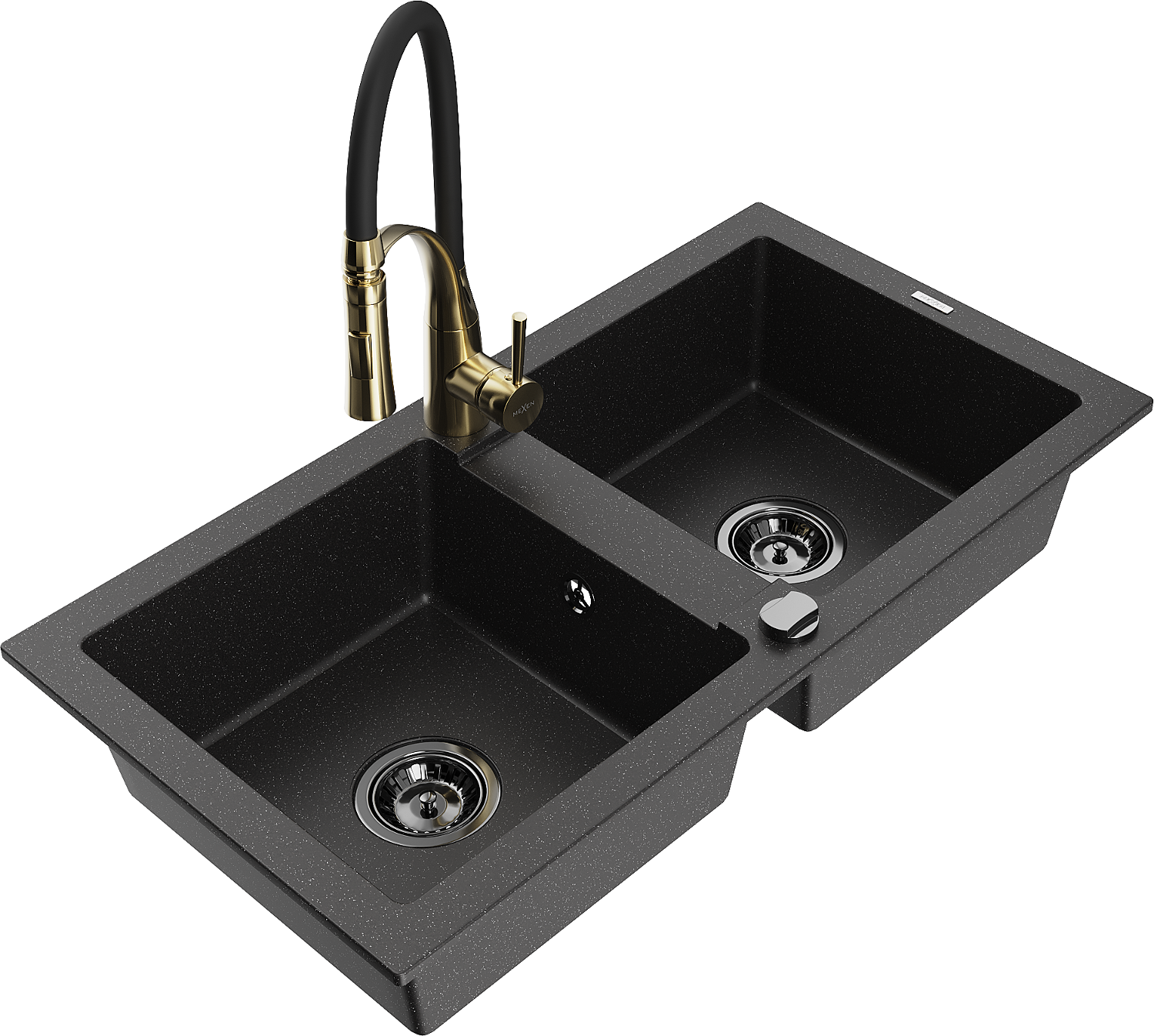 Mexen Mario fregadero de granito de 2 cámaras con grifo de cocina Aster, negro/metálico plateado - 6504-73-73450-57-B