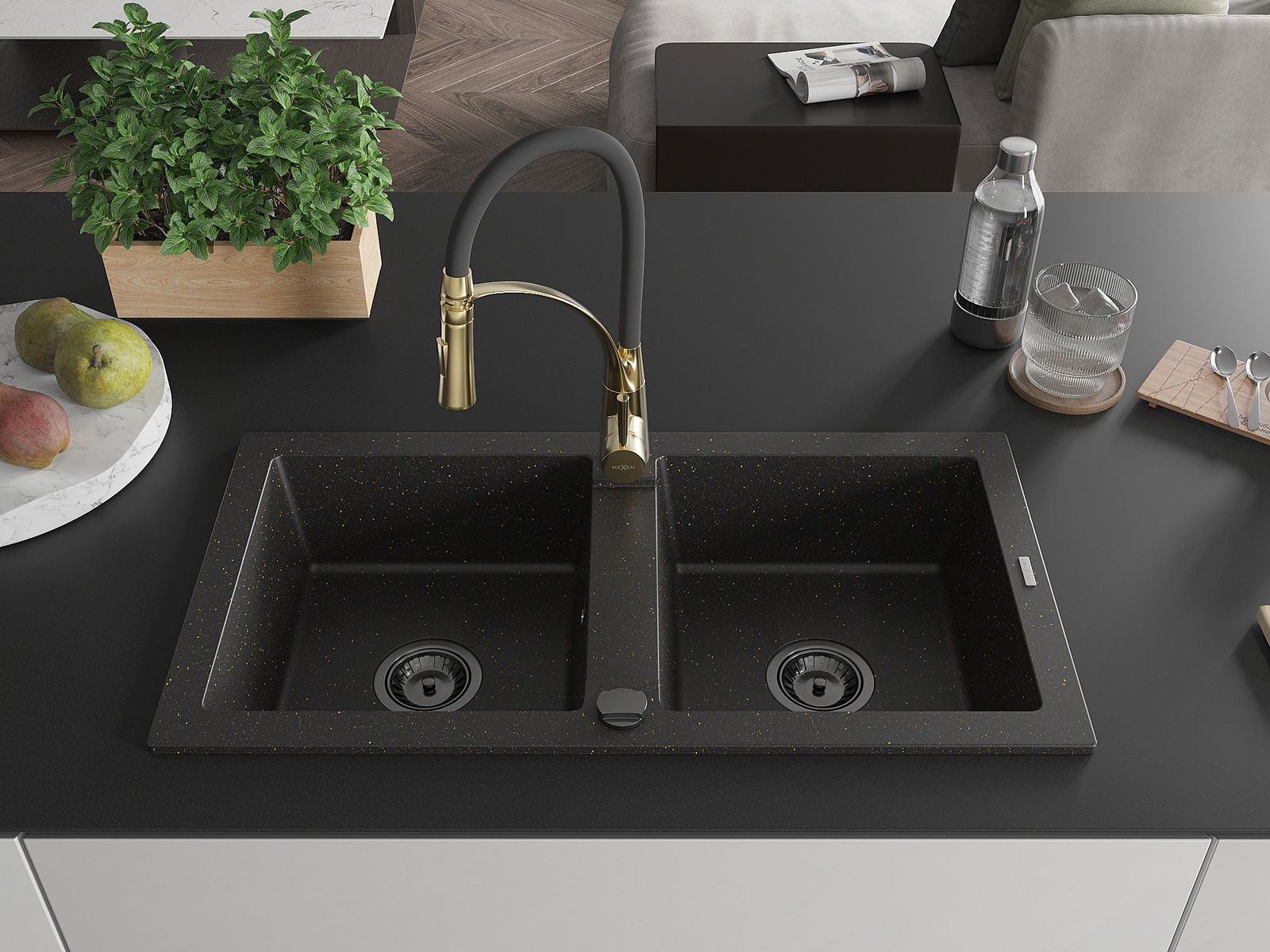 Mexen Mario fregadero de granito de 2 cubetas con grifo de cocina Aster, negro/metálico dorado - 6504-75-73450-57-B