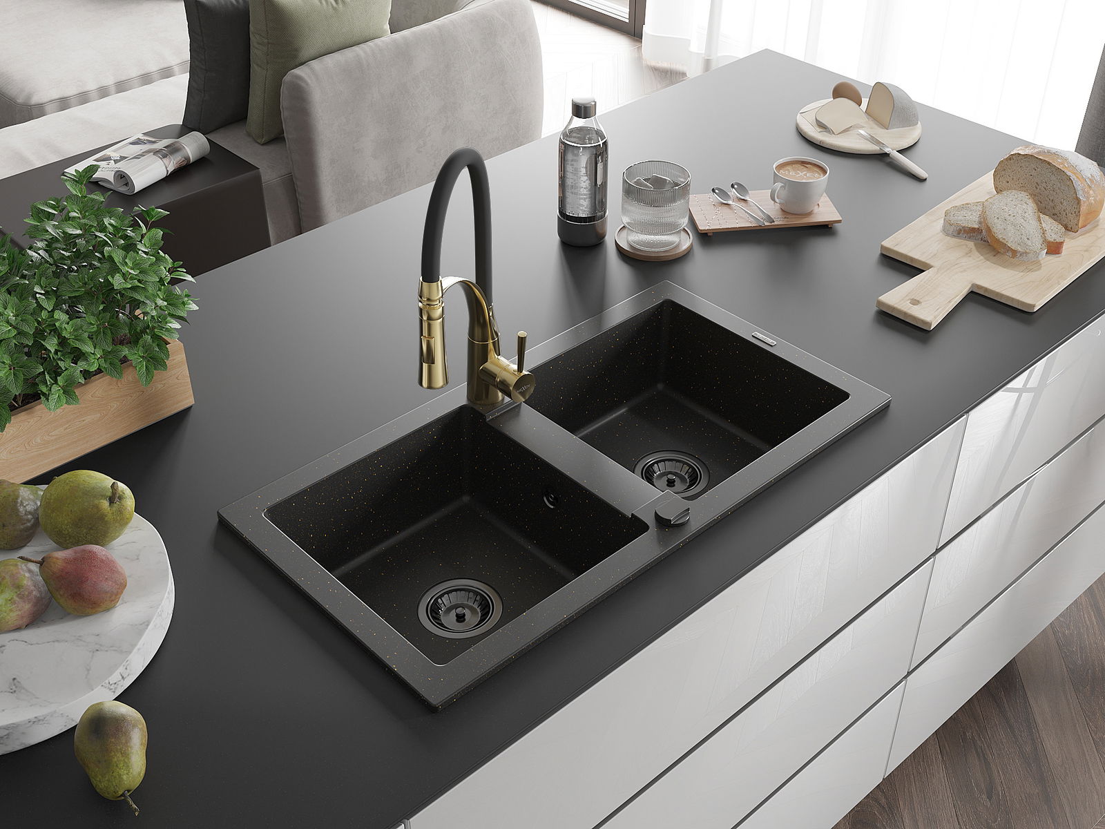 El fregadero está hecho de granito de alta calidad. Constituye un complemento elegante y, sobre todo, práctico para cualquier cocina, independientemente de su estilo. La alta calidad y durabilidad del granito aseguran un uso durante muchos años.