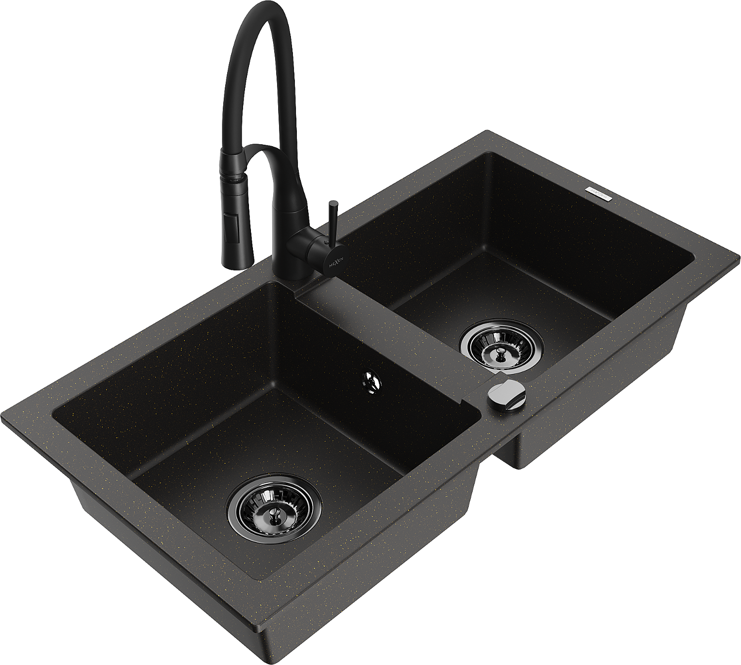 Mexen Mario fregadero de granito de 2 senos con grifo de cocina Aster, negro/dorado metálico - 6504-75-73450-70-B