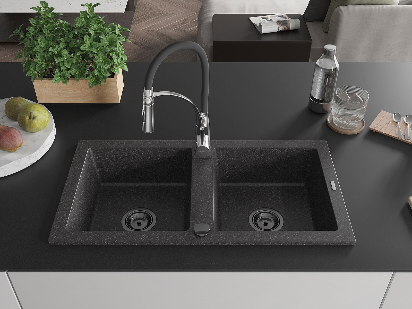 Mexen Mario fregadero de granito de 2 cubetas con grifo de cocina Aster, negro moteado - 6504-76-73450-07-B