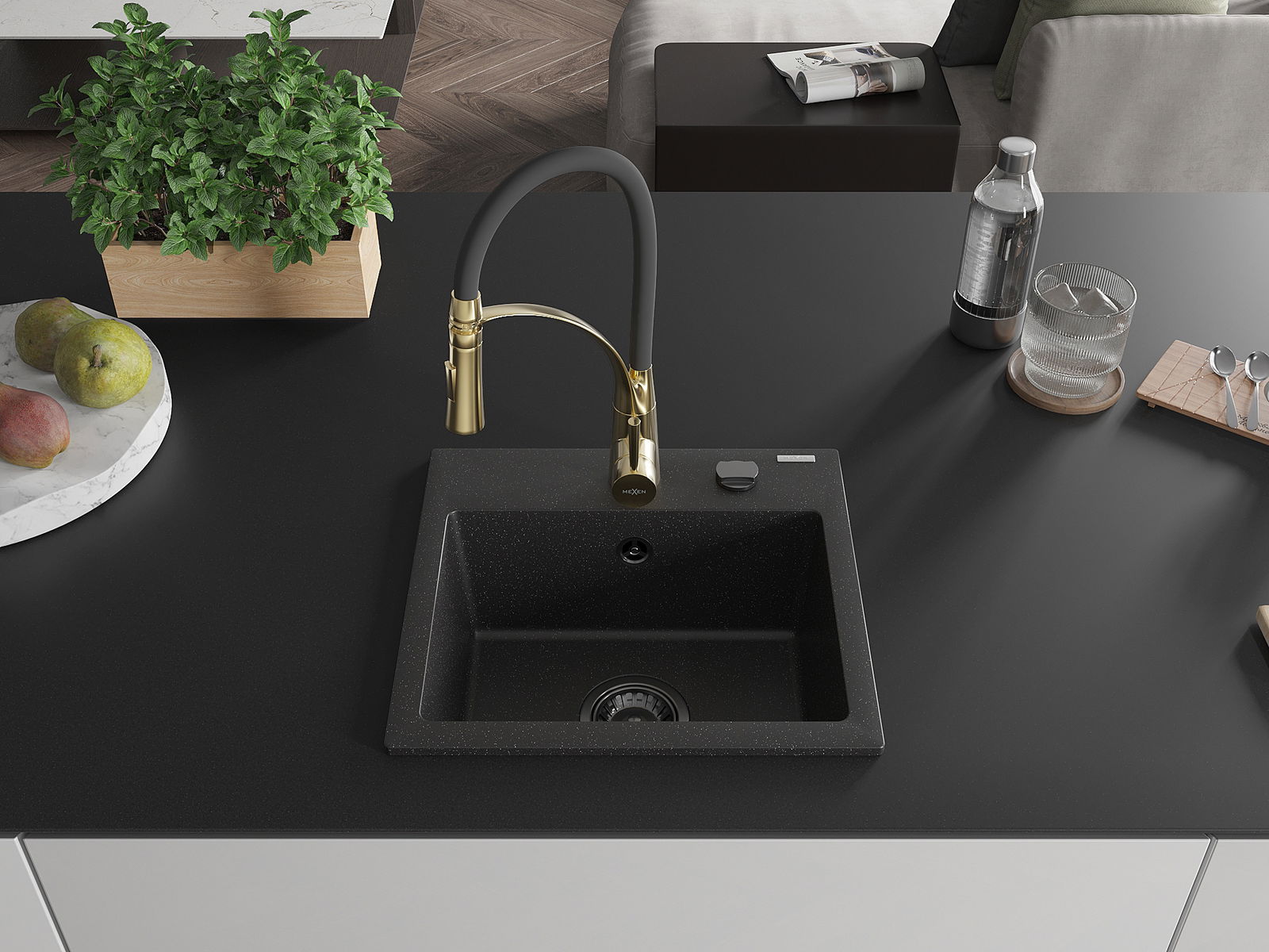 Mexen Milo fregadero de granito de 1 cubeta con grifo de cocina Aster, negro/metálico plateado - 6505-73-73450-57-B