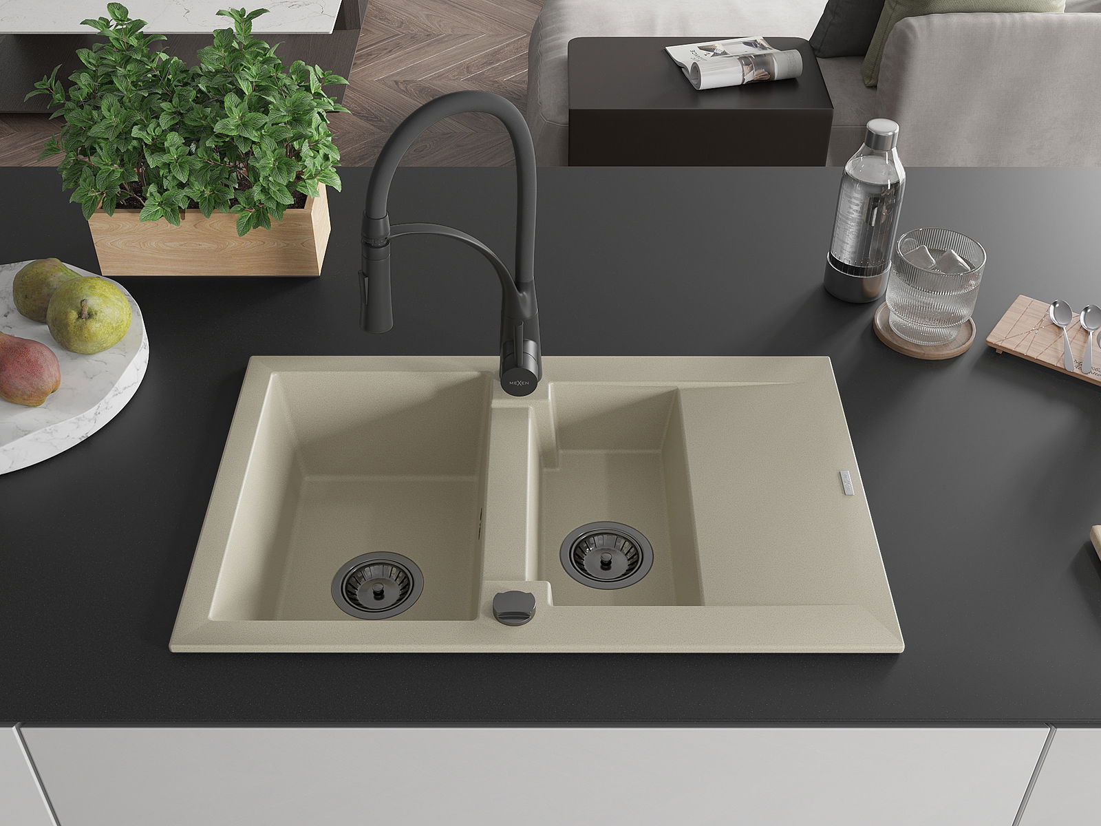 Mexen Gaspar fregadero de granito de 1,5 senos con escurridor y grifo de cocina Aster, beige - 6507-69-73450-70-B