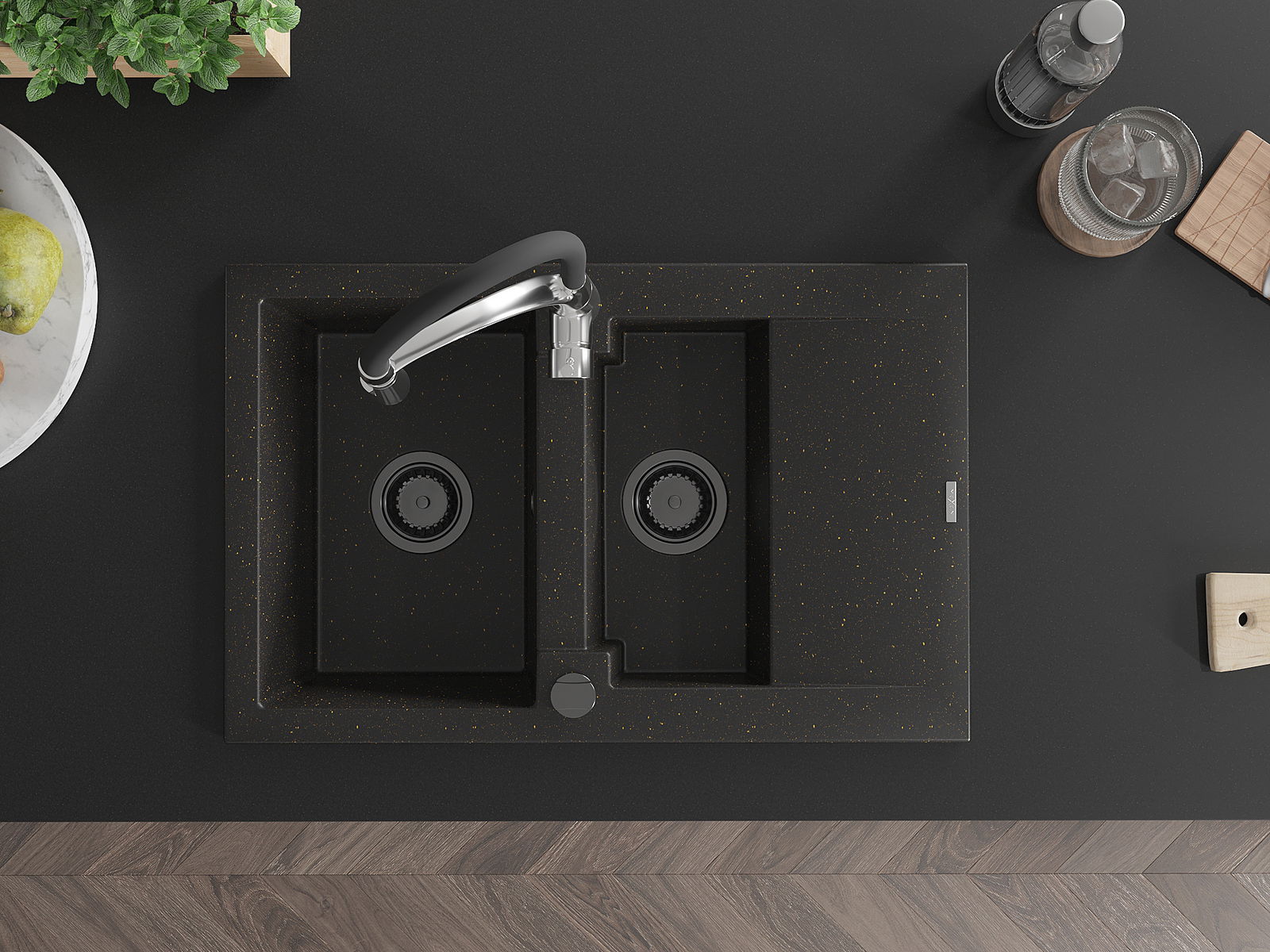 Mexen Gaspar fregadero de granito de 1,5 senos con escurridor y grifo de cocina Aster, negro/metal dorado - 6507-75-73450-07-B