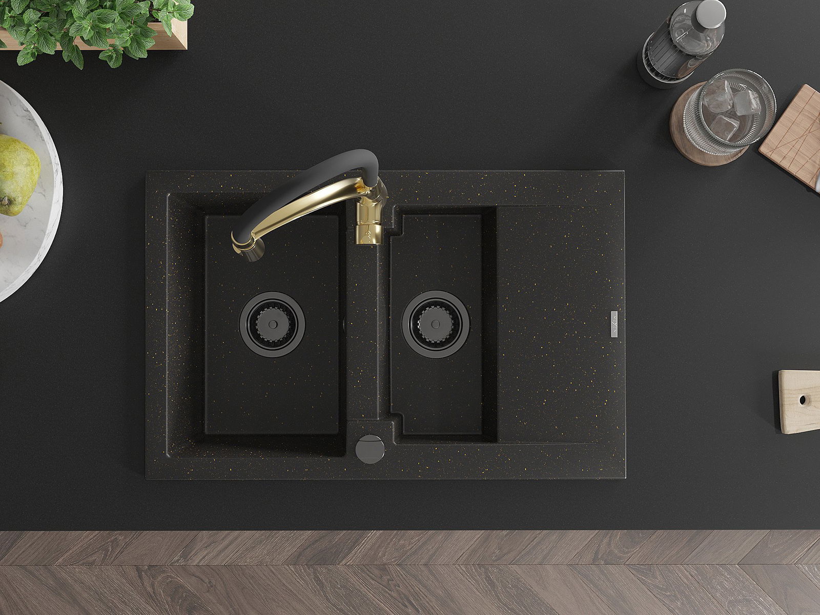 Mexen Gaspar fregadero de cocina de granito de 1,5 senos con escurridor y grifo Aster, negro/metalizado dorado