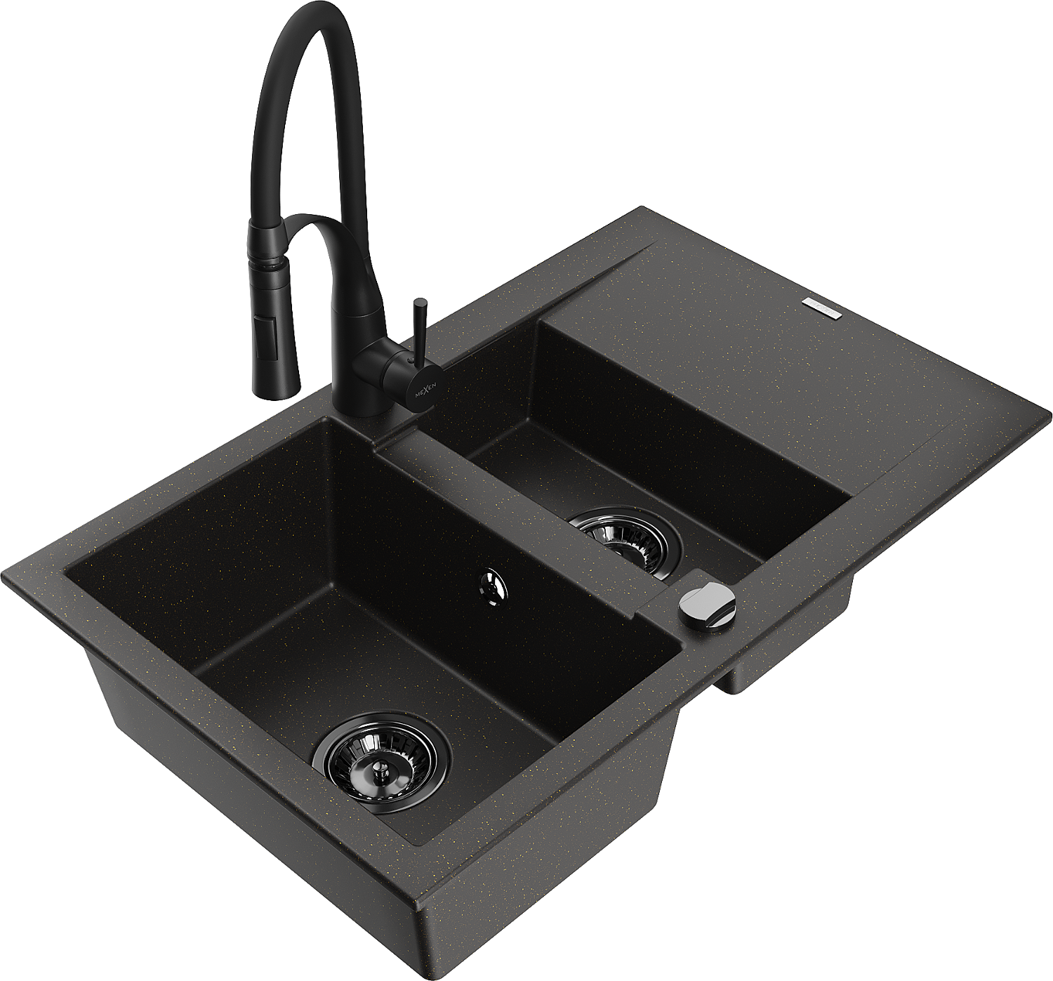Mexen Gaspar fregadero de granito de 1,5 senos con escurridor y grifo de cocina Aster, negro/oro metálico - 6507-75-73450-70-B