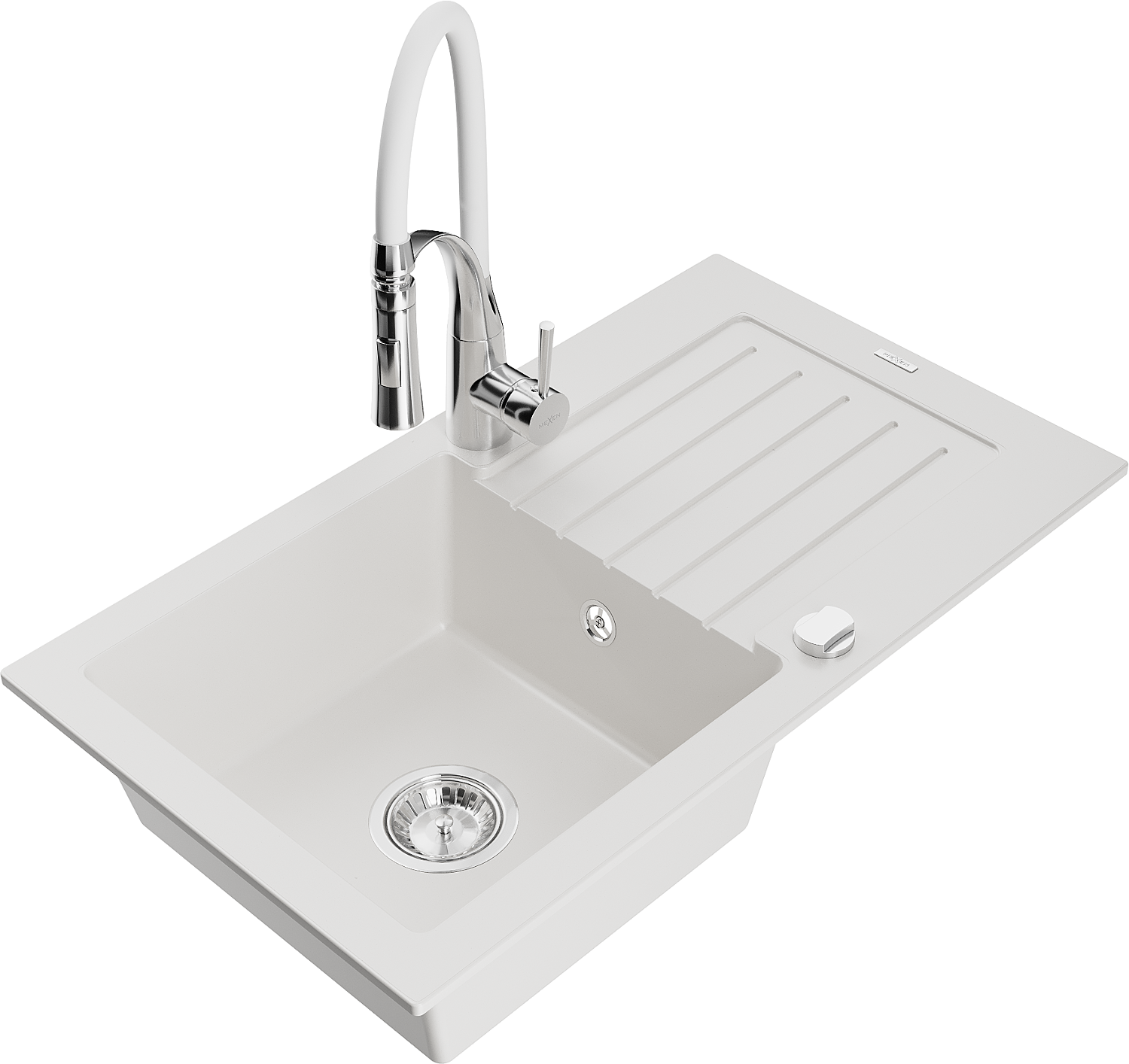 Mexen Pablo fregadero de granito de 1 cubeta con escurridor y grifo de cocina Aster, blanco - 6510-20-73450-02