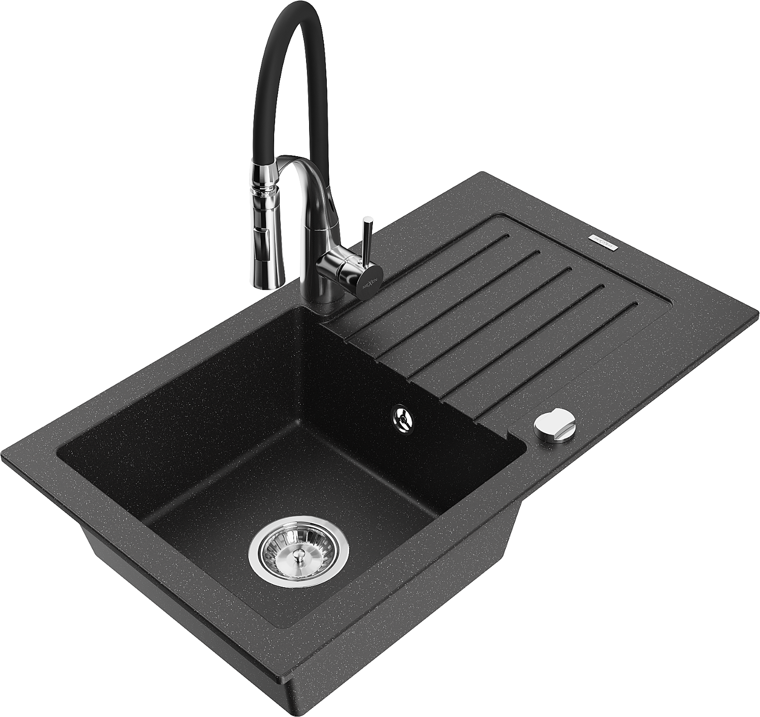 Mexen Pablo fregadero de granito de 1 cubeta con escurridor y grifo de cocina Aster, negro/plateado metálico - 6510-73-73450-07