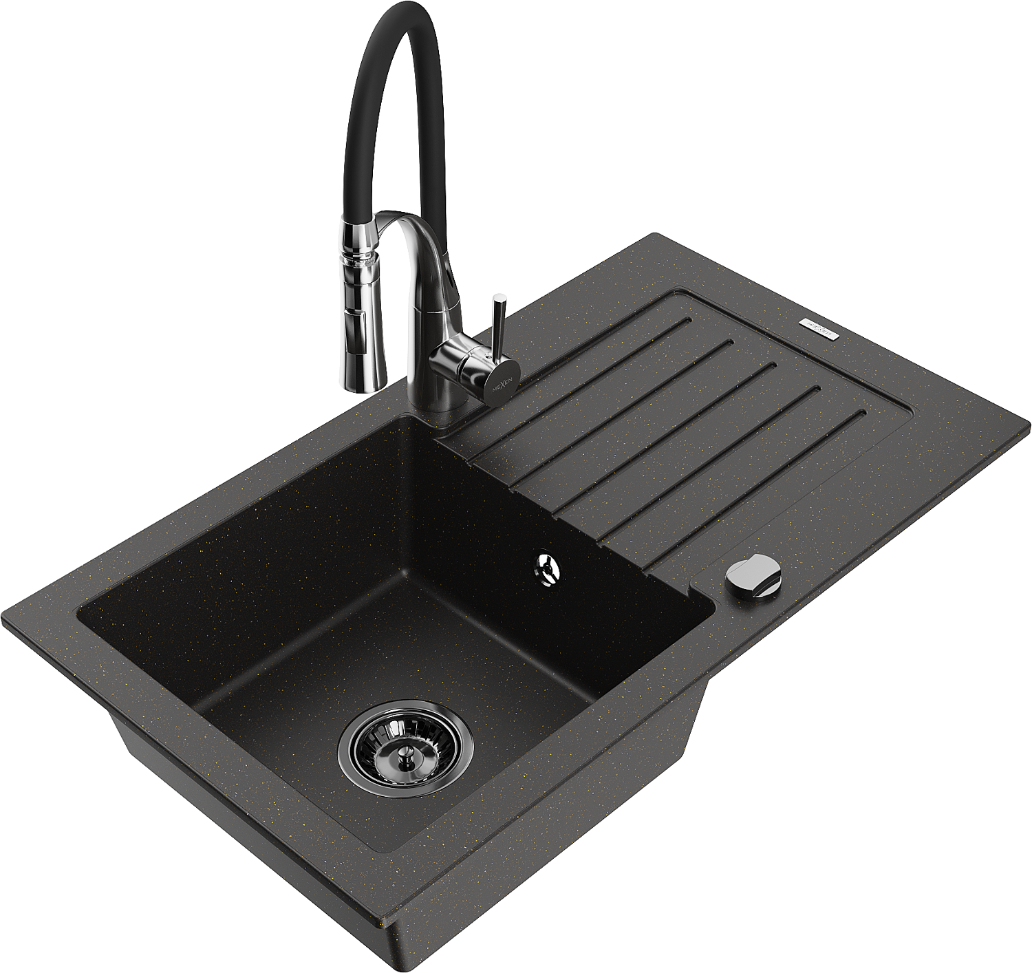 Mexen Pablo fregadero de granito de 1 seno con escurridor y grifo de cocina Aster, metálico negro/dorado - 6510-75-73450-07-B