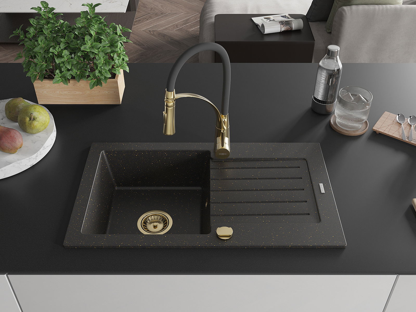 Mexen Pablo fregadero de granito de 1 seno con escurridor y grifo de cocina Aster, negro/dorado metálico - 6510-75-73450-57-G