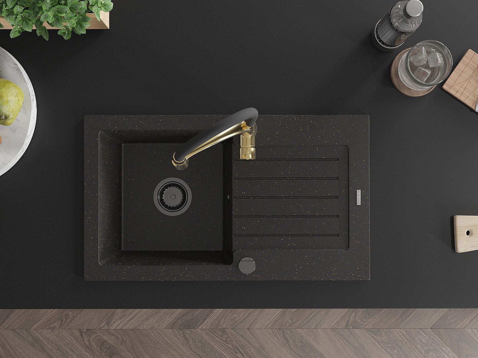 Mexen Pablo fregadero de granito de 1 seno con escurridor y grifo de cocina Aster, negro/oro metálico - 6510-75-73450-57-B