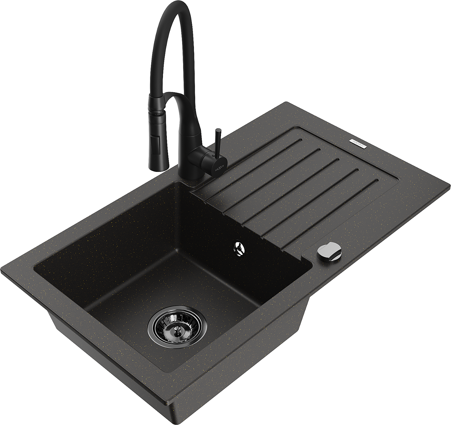 Mexen Pablo fregadero de granito de 1 cubeta con escurridor y grifo de cocina Aster, negro/dorado metálico - 6510-75-73450-70-B