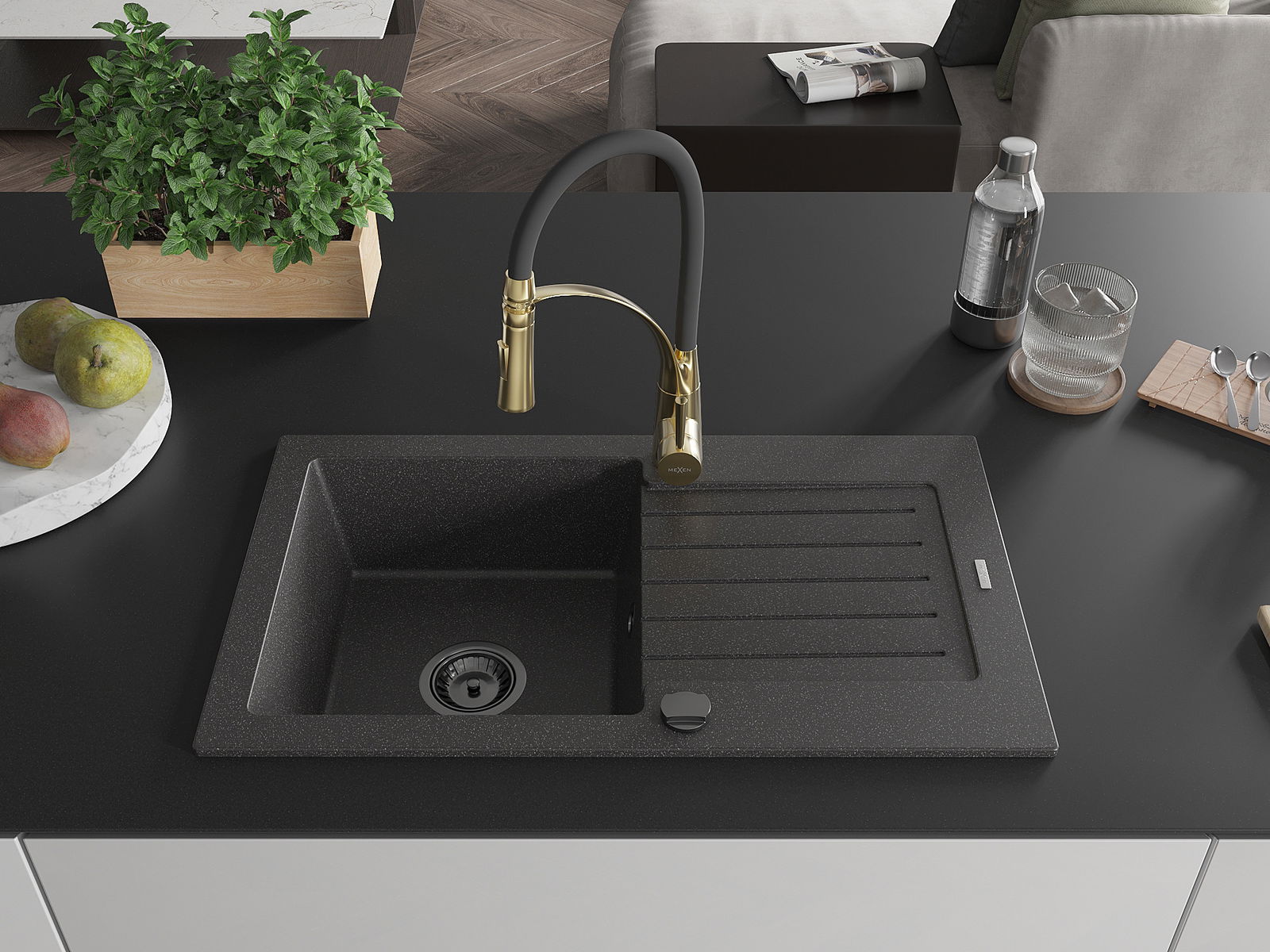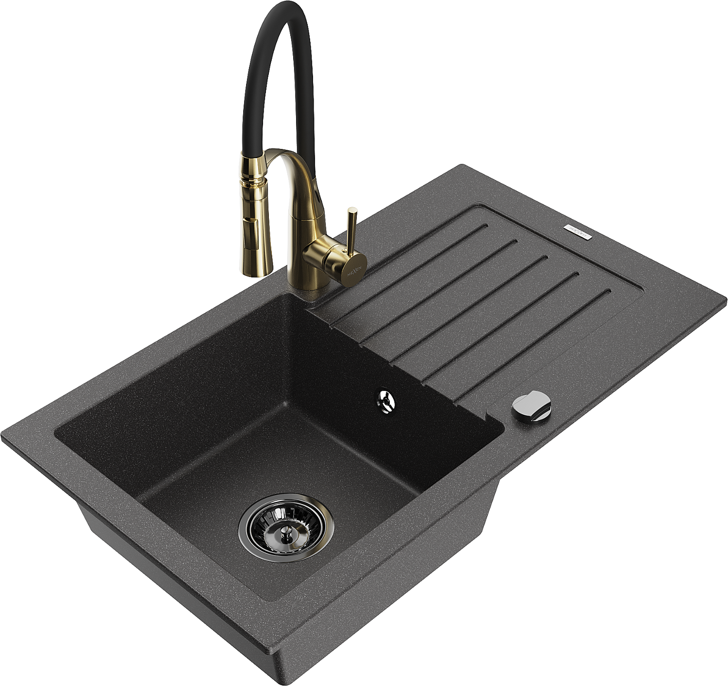 Mexen Pablo fregadero de granito de 1 compartimento con escurridor y grifo de cocina Aster, negro moteado - 6510-76-73450-57-B