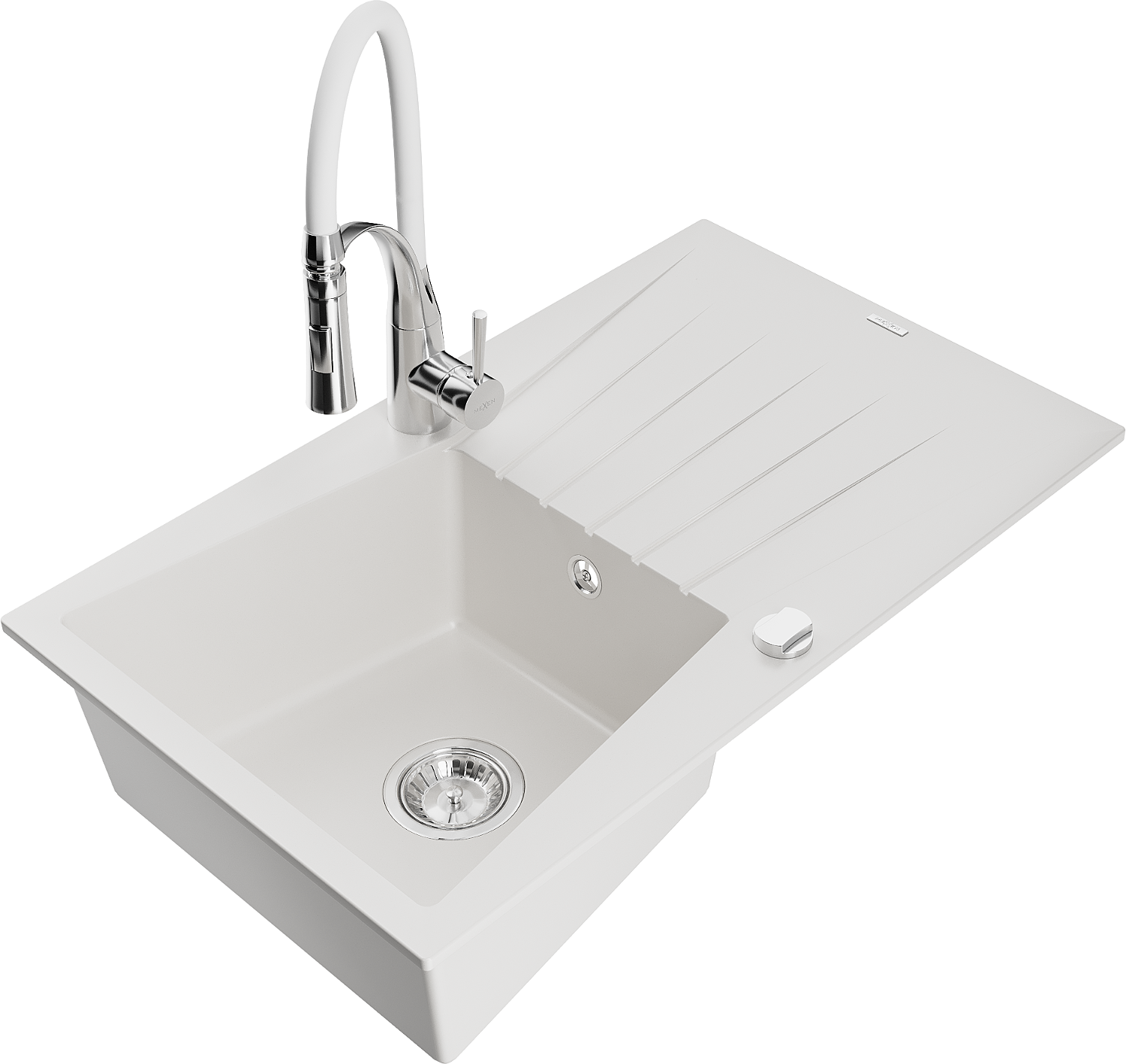 Mexen Cesar fregadero de granito de 1 cubeta con escurridor y grifo de cocina Aster, blanco - 6514-20-73450-02