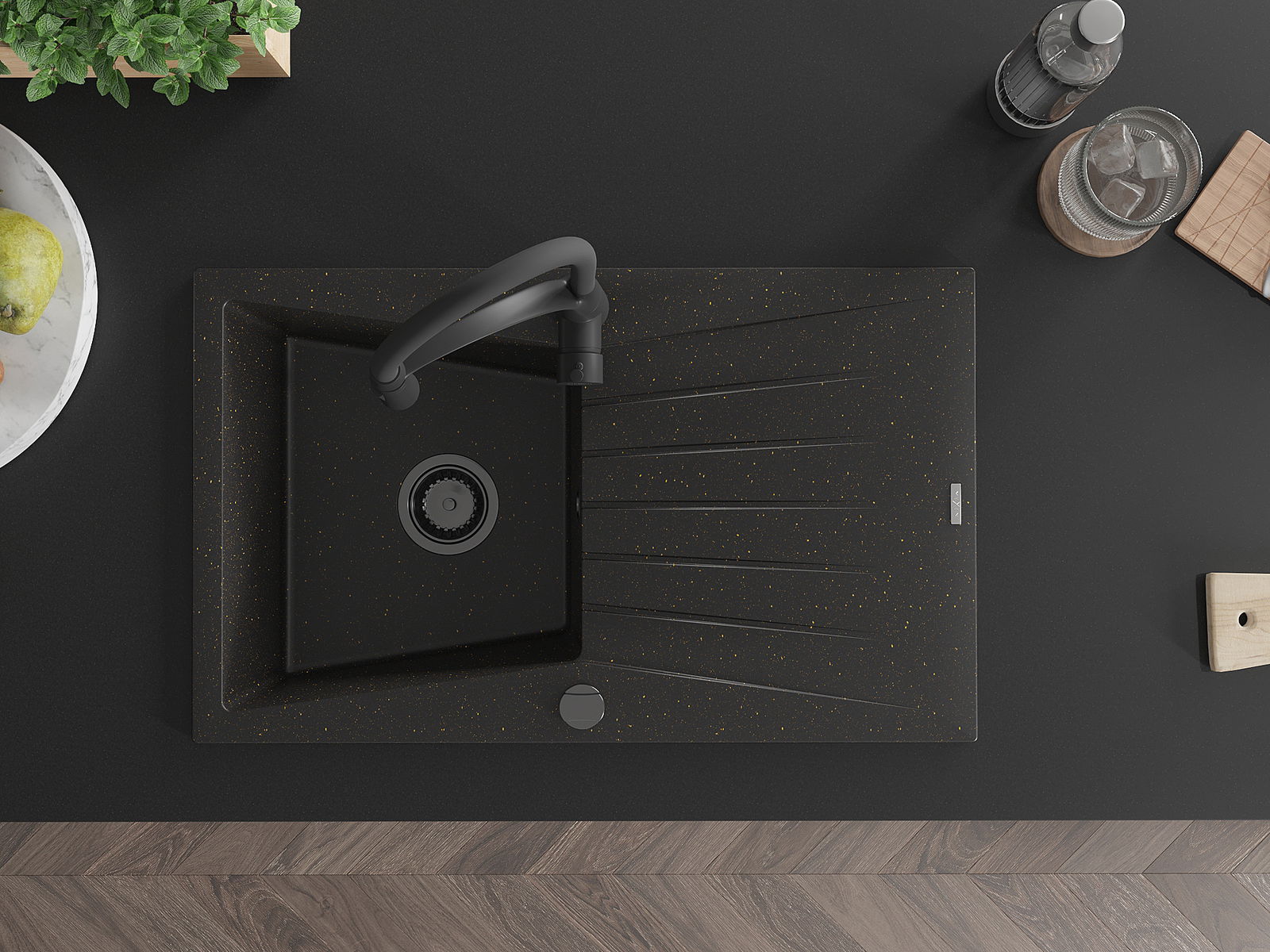 Mexen Cesar fregadero de granito de 1 seno con escurridor y grifo de cocina Aster, negro/dorado metálico - 6514-75-73450-70-B