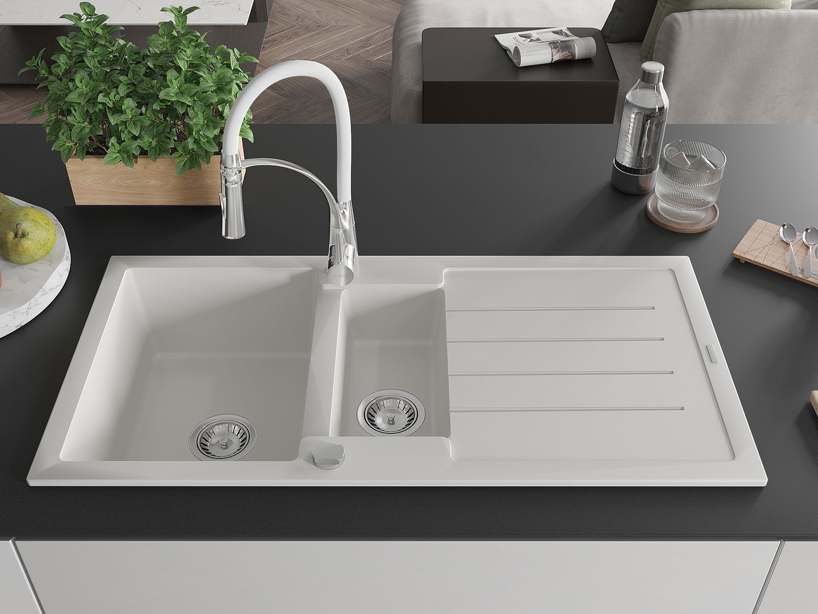 Mexen Andres fregadero de granito de 1,5 cubetas con escurridor y grifo de cocina Aster, blanco - 6515-20-73450-02
