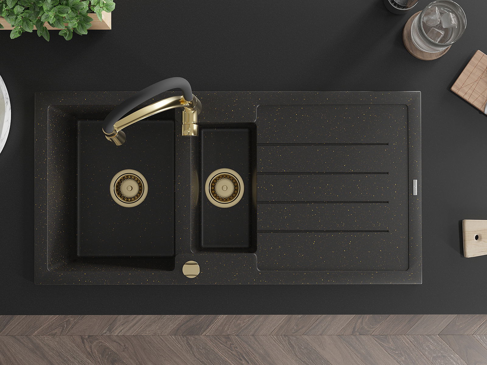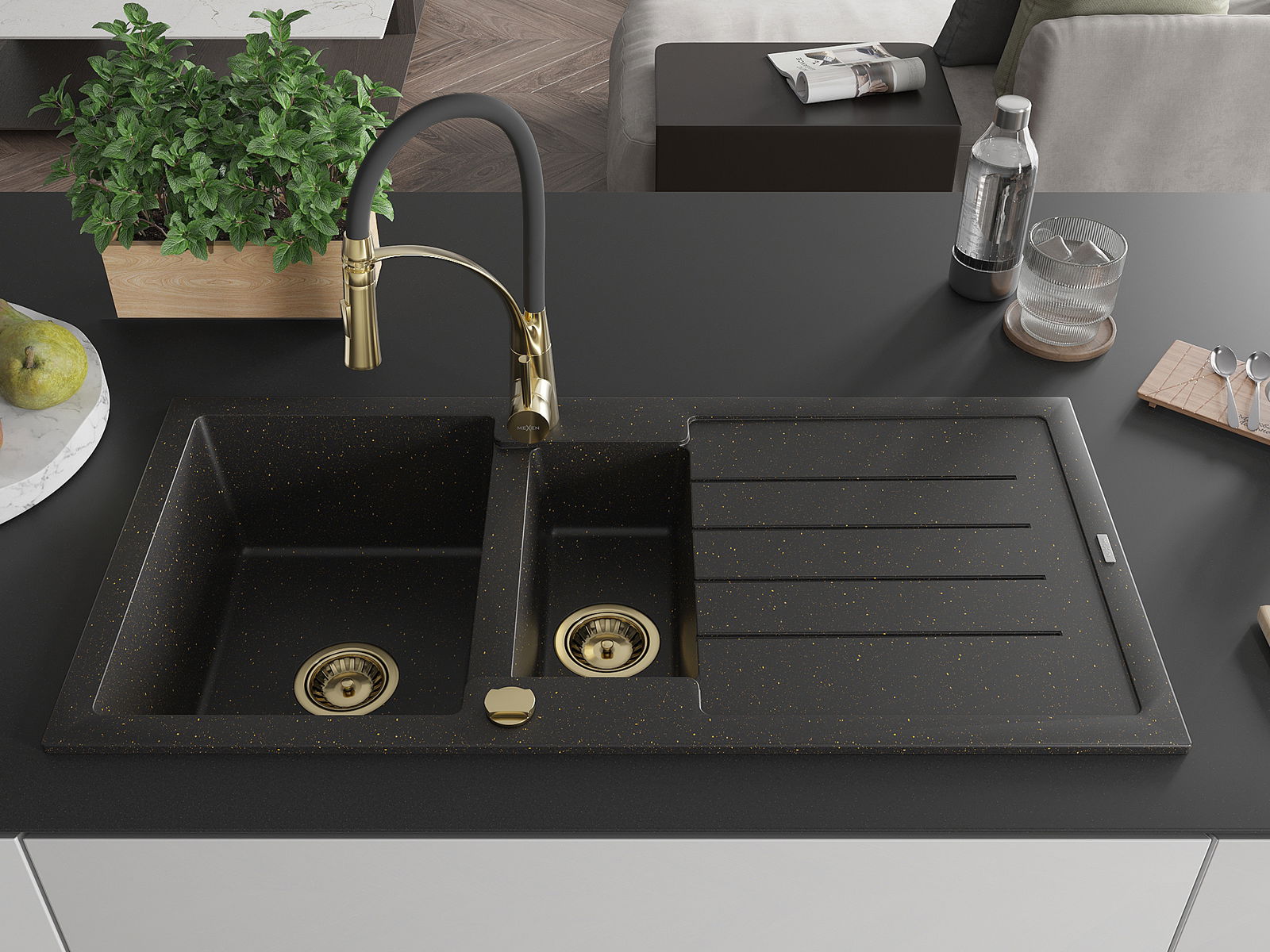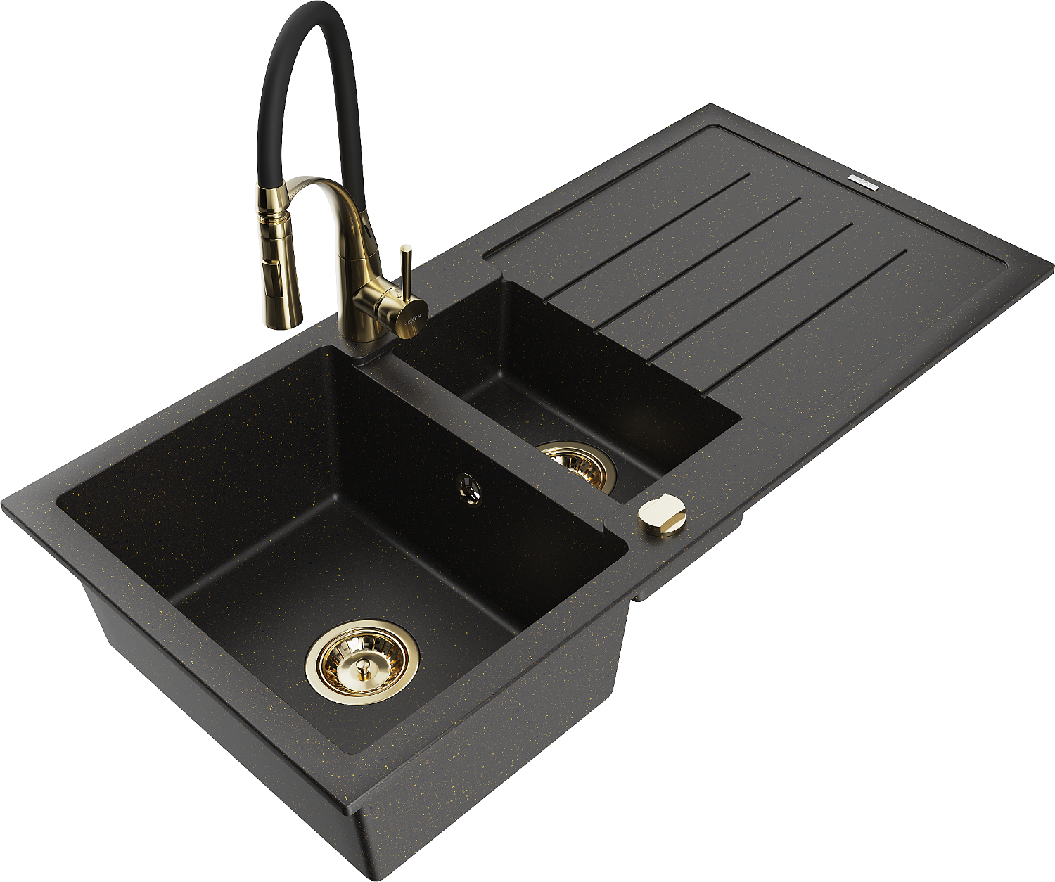Mexen Andres fregadero de granito de 1,5 senos con escurridor y grifo de cocina Aster, negro/oro metálico - 6515-75-73450-57-G
