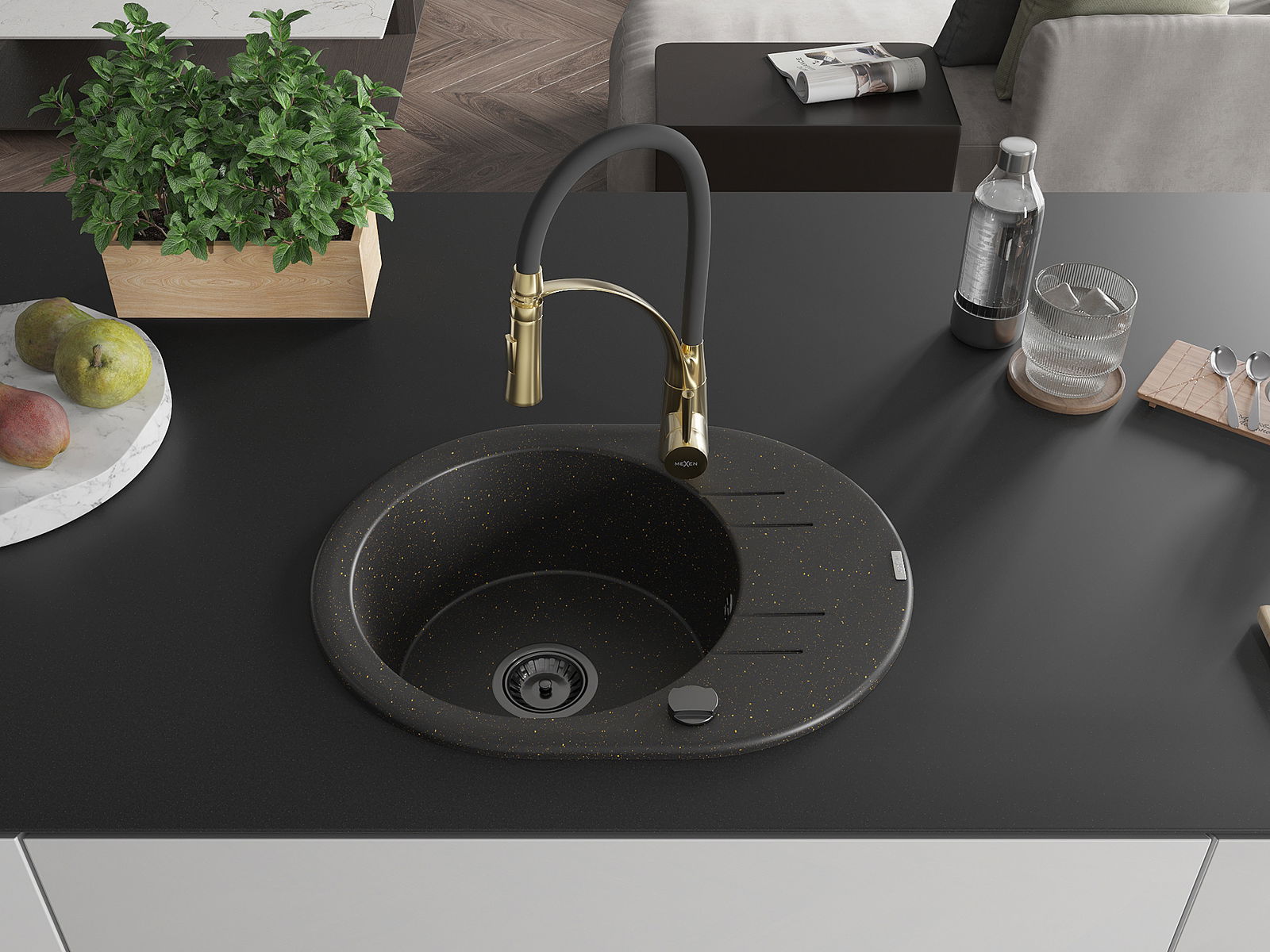 Mexen Kevin fregadero de granito de 1 tazón con escurridor y grifo de cocina Aster, negro/dorado metálico - 6517-75-73450-57-B