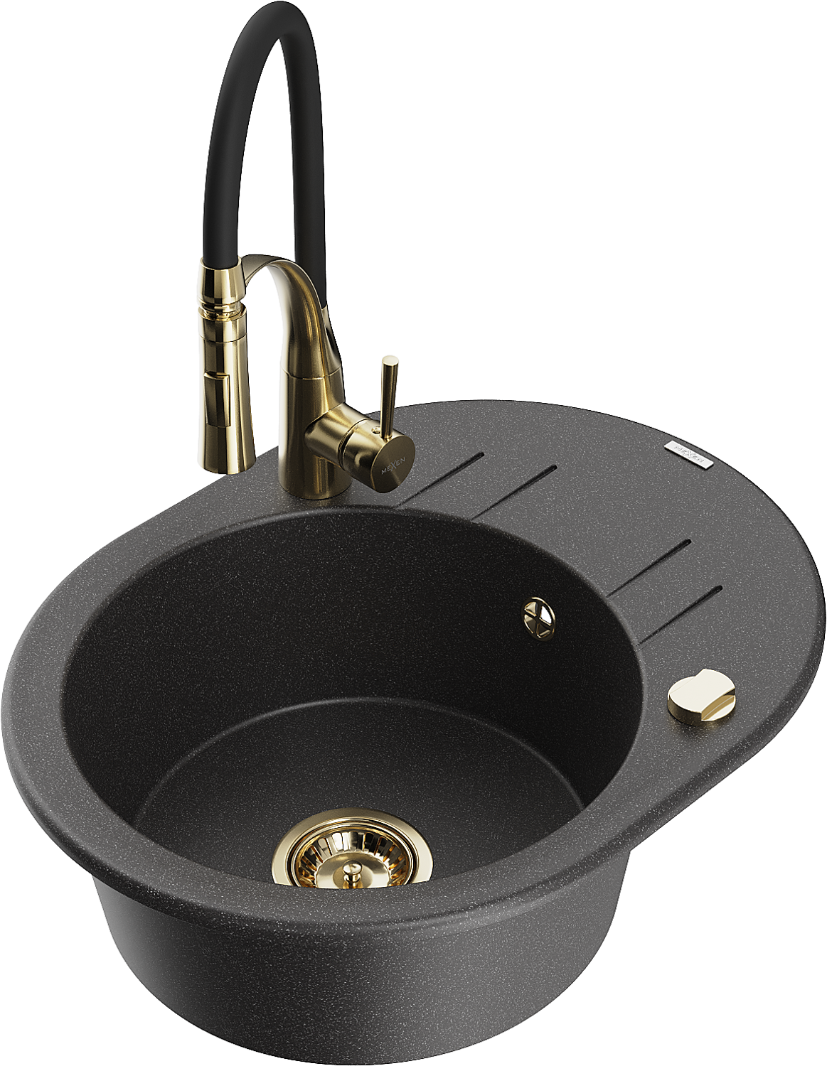 Mexen Kevin fregadero de granito de 1 cubeta con escurridor y grifo de cocina Aster, negro moteado - 6517-76-73450-57-G
