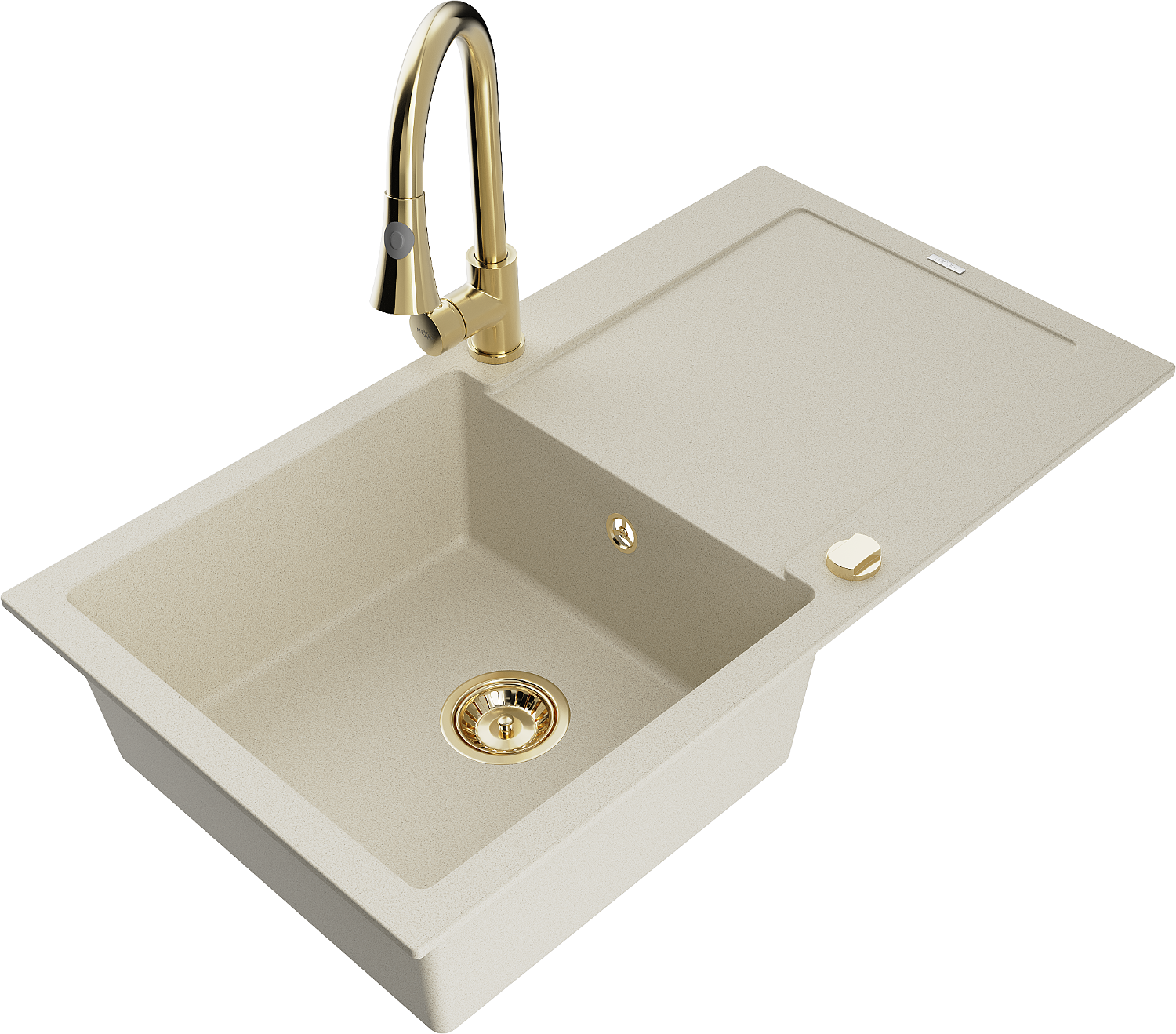 Mexen Leo fregadero de granito de 1 cubeta con escurridor y grifo de cocina Elia, beige - 6501-69-670101-50