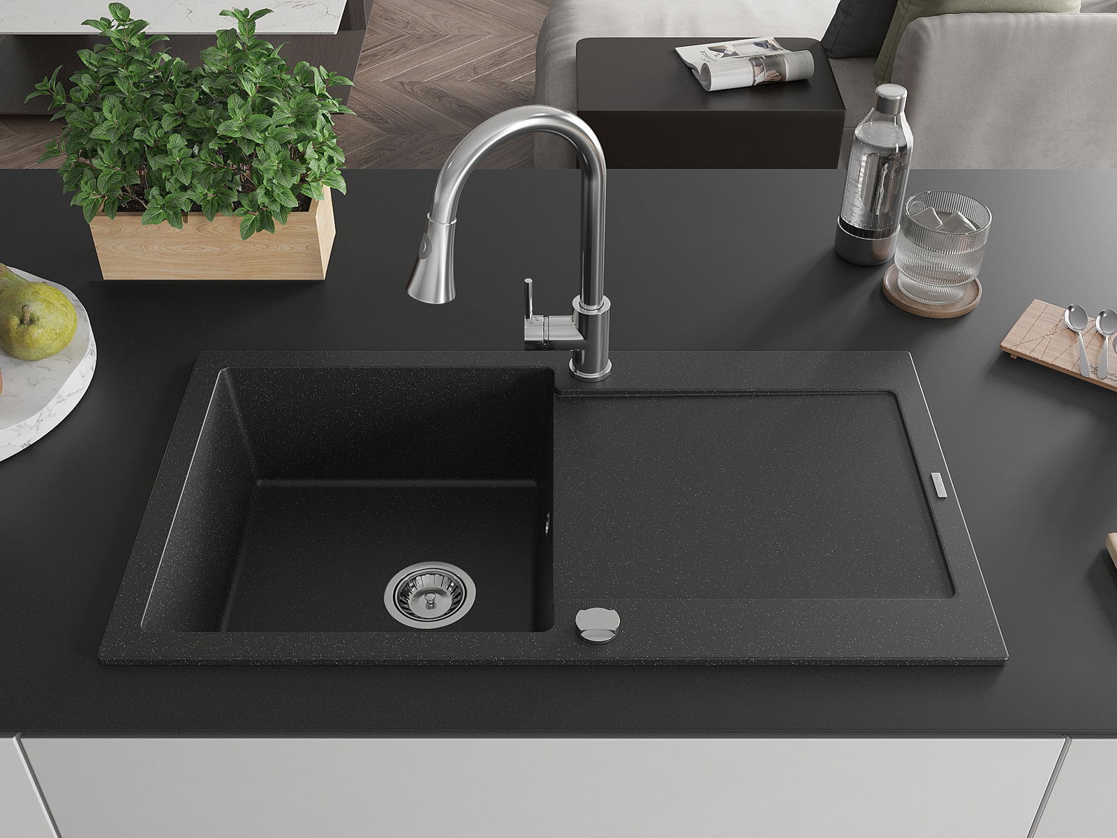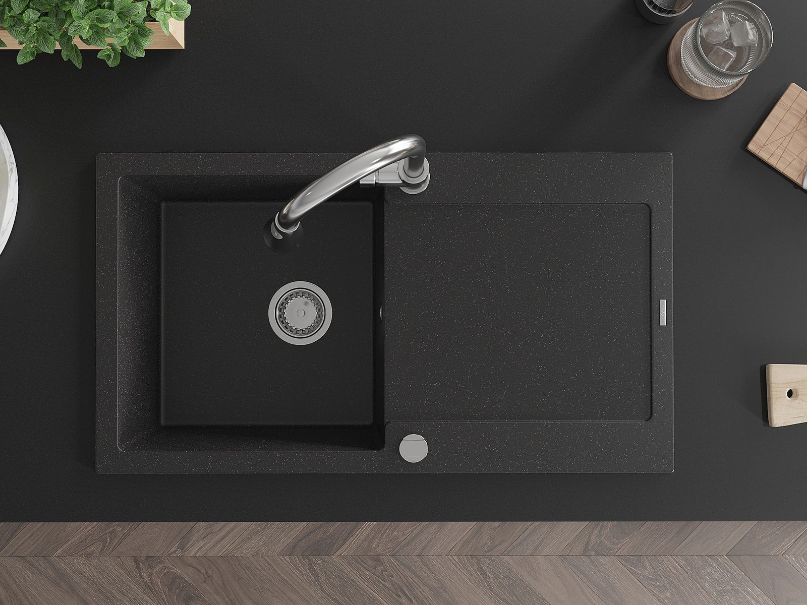 El fregadero está hecho de granito de alta calidad. Constituye un complemento elegante y, sobre todo, práctico para cualquier cocina, independientemente de su estilo. La alta calidad y durabilidad del granito aseguran un uso durante muchos años.
