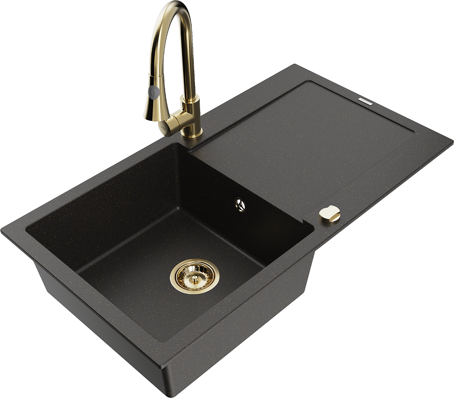 Mexen Leo fregadero de granito de 1 cubeta con escurridor y grifo de cocina Elia, negro/oro metálico - 6501-75-670101-50
