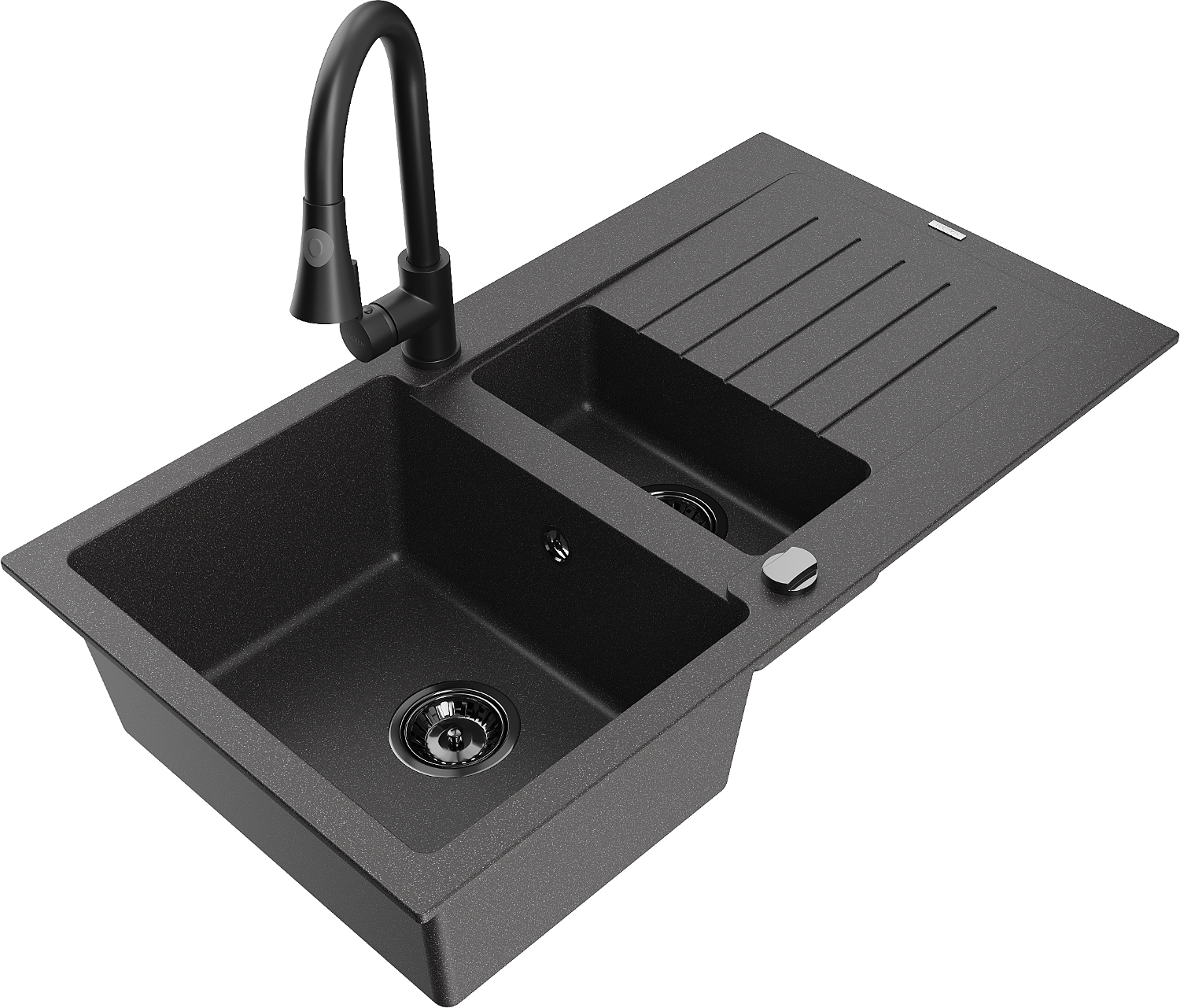 Mexen Matias fregadero de granito 1,5 senos con escurridor y grifo de cocina Elia, negro moteado - 6502-76-670101-70-B