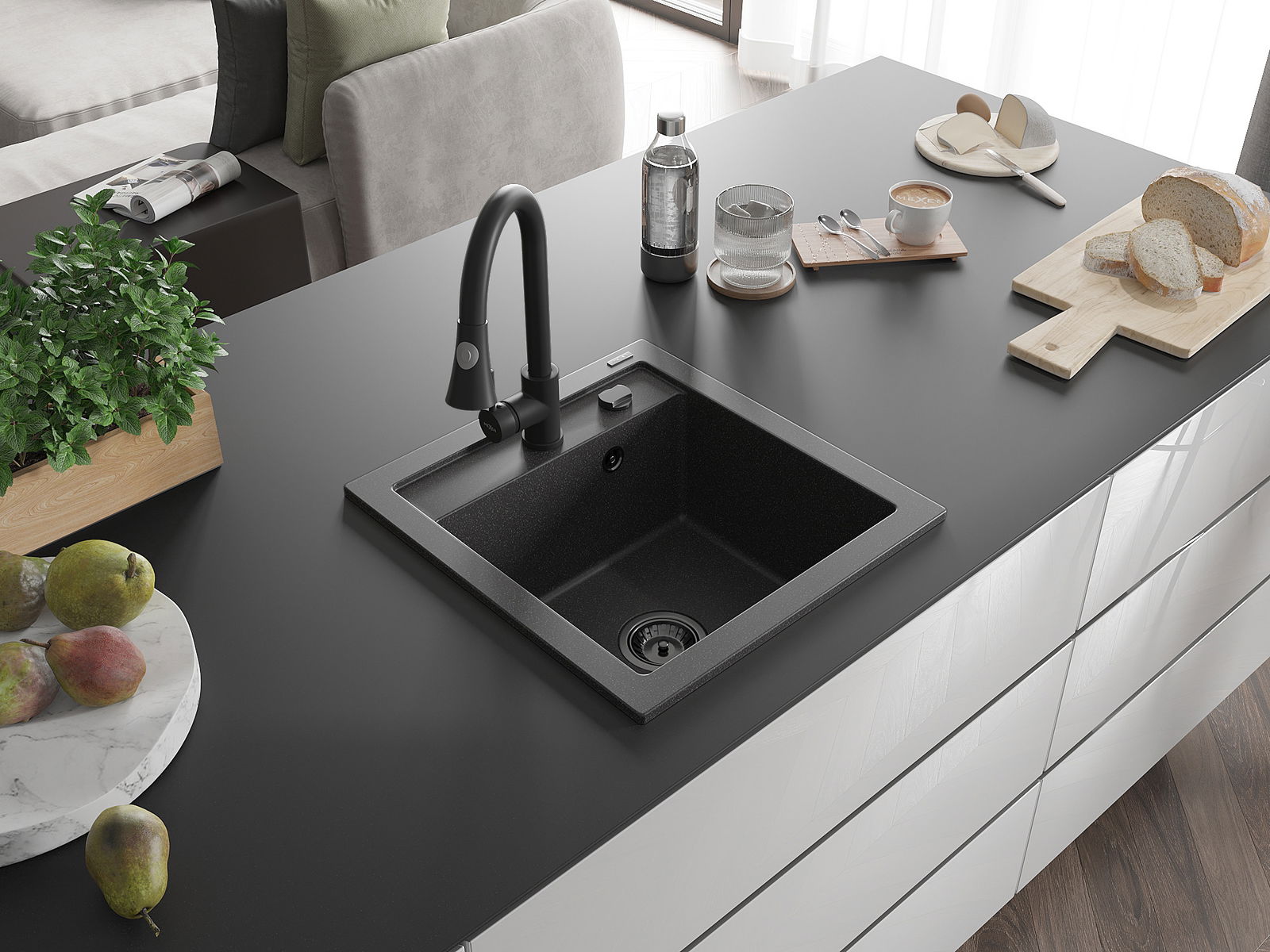 El fregadero está hecho de granito de alta calidad. Constituye un complemento elegante y, sobre todo, práctico para cualquier cocina, independientemente de su estilo. La alta calidad y durabilidad del granito aseguran un uso durante muchos años.
