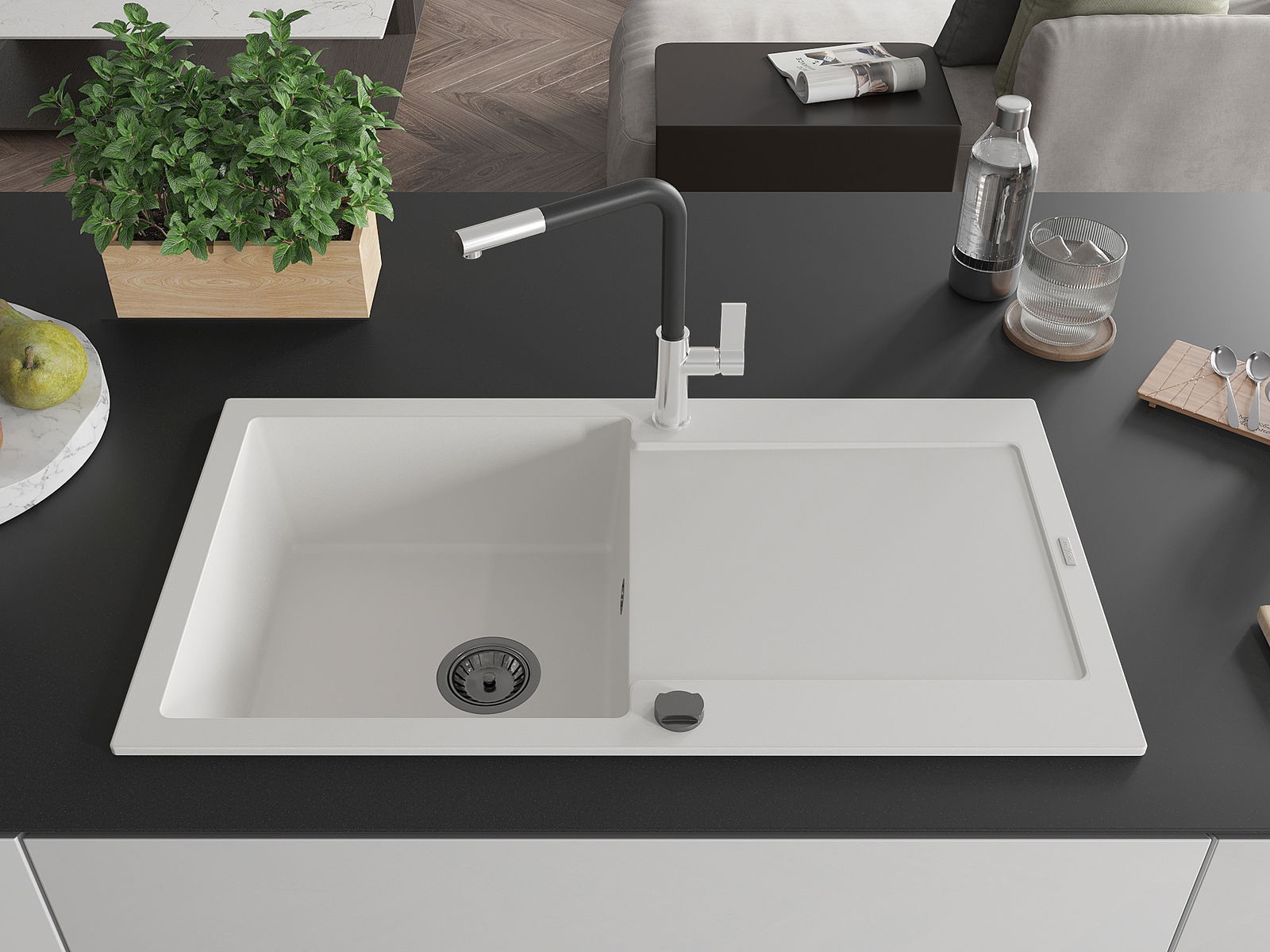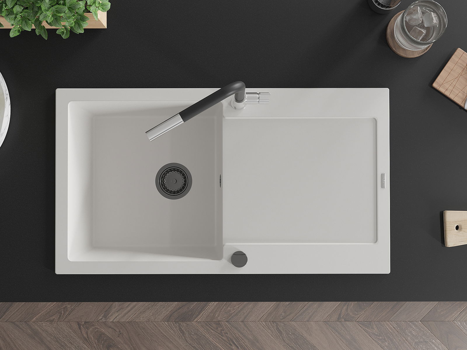 El fregadero está hecho de granito de alta calidad. Es un complemento elegante y, sobre todo, práctico para cualquier cocina, independientemente de su estilo. La alta calidad y durabilidad del granito aseguran un uso prolongado durante años.