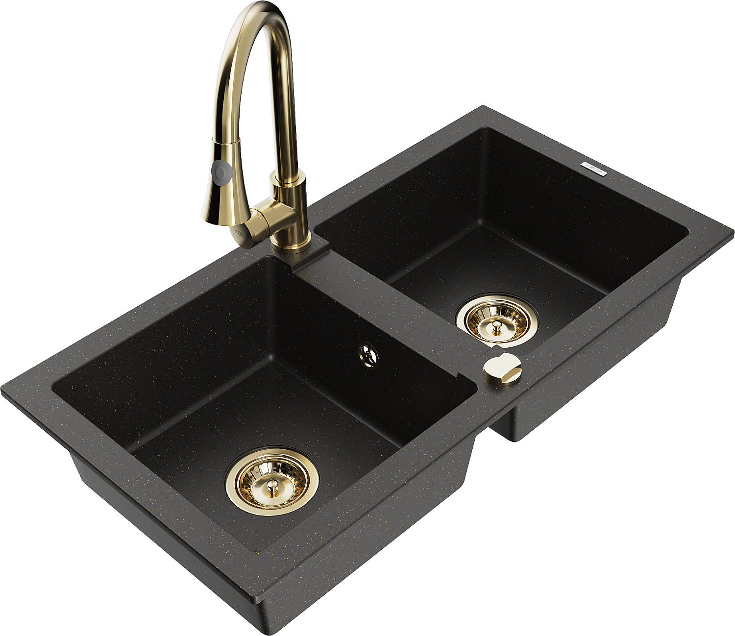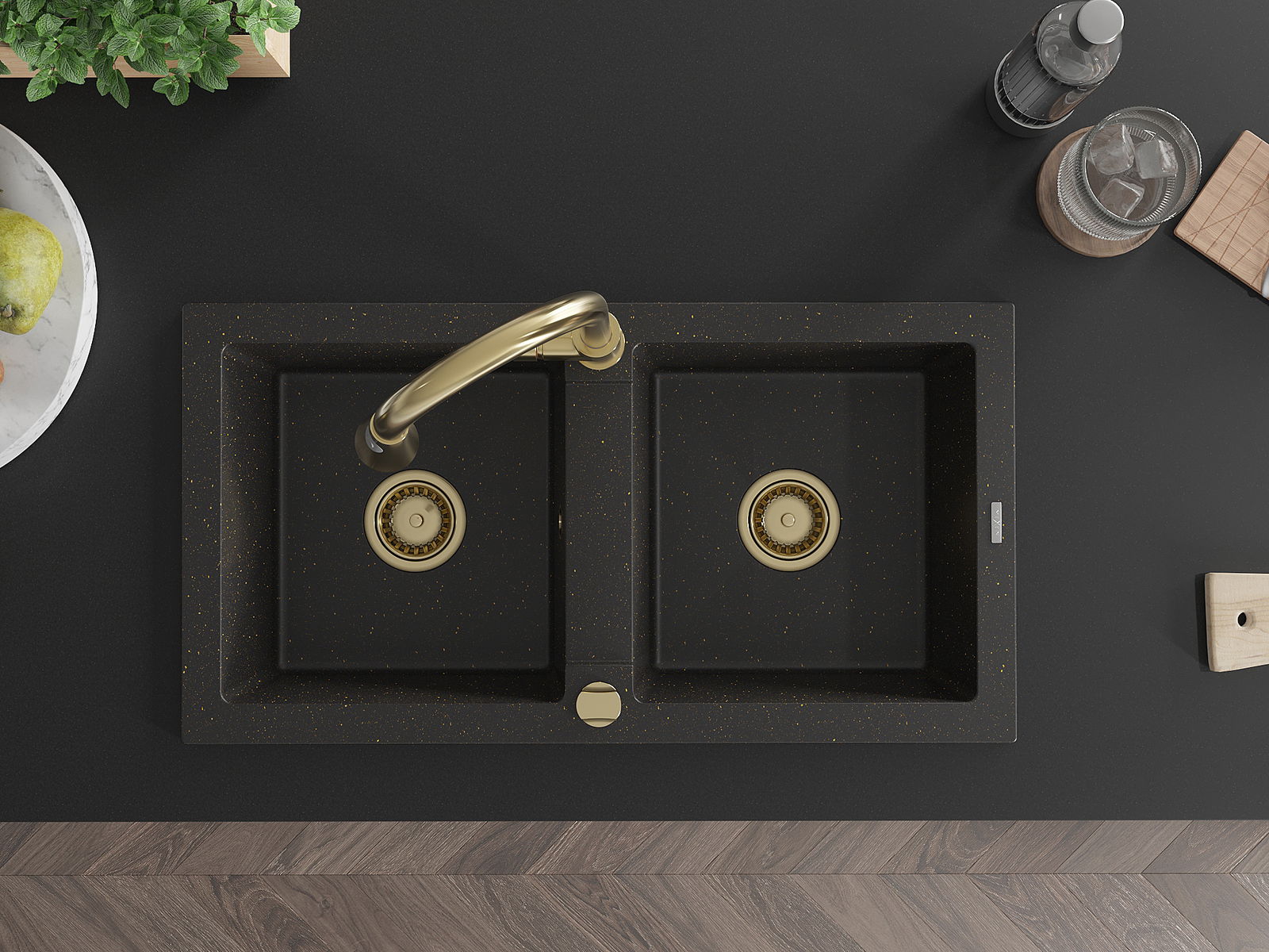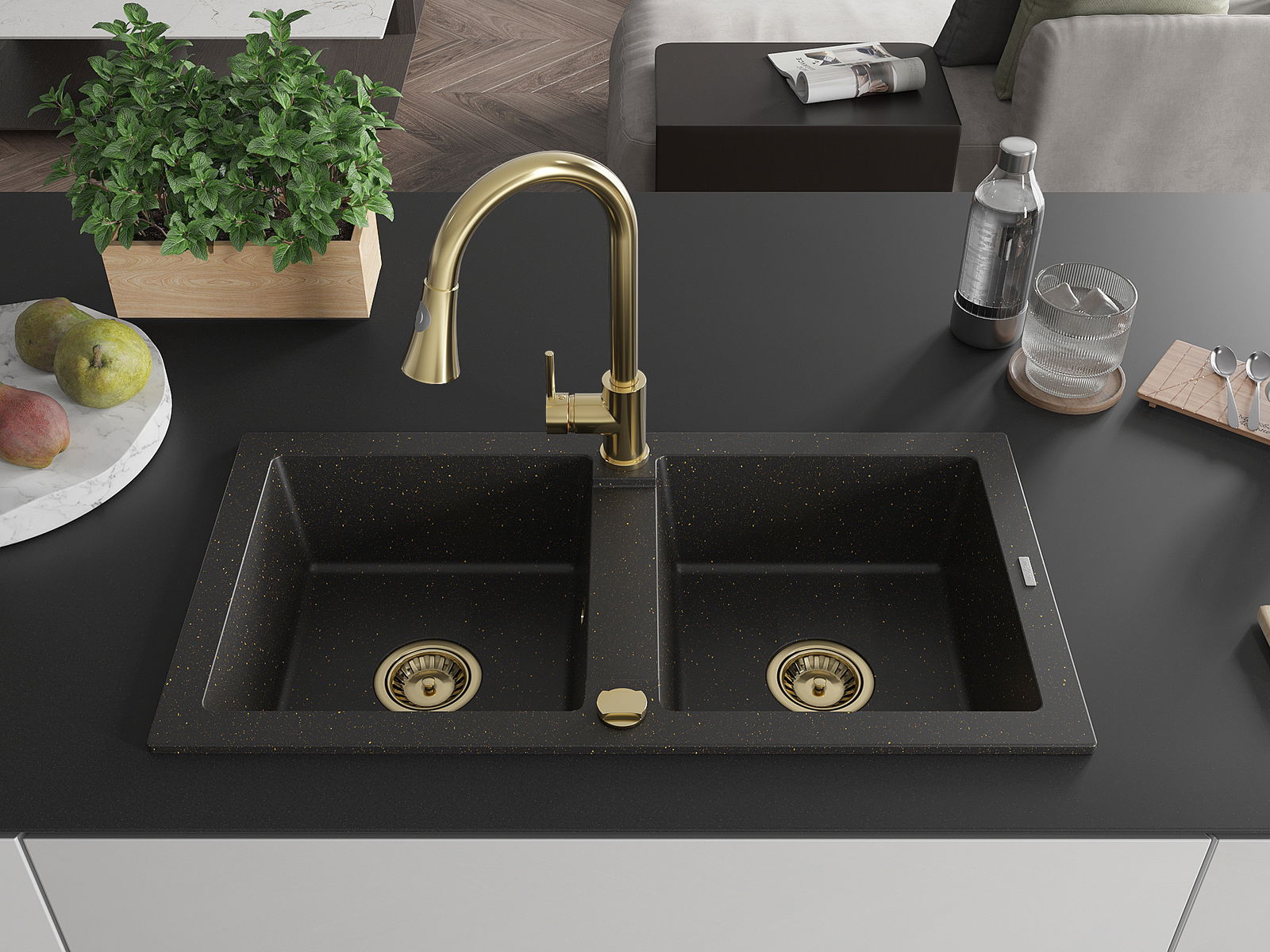 Mexen Mario fregadero de granito de 2 senos con grifo de cocina Elia, negro/dorado metálico - 6504-75-670101-50