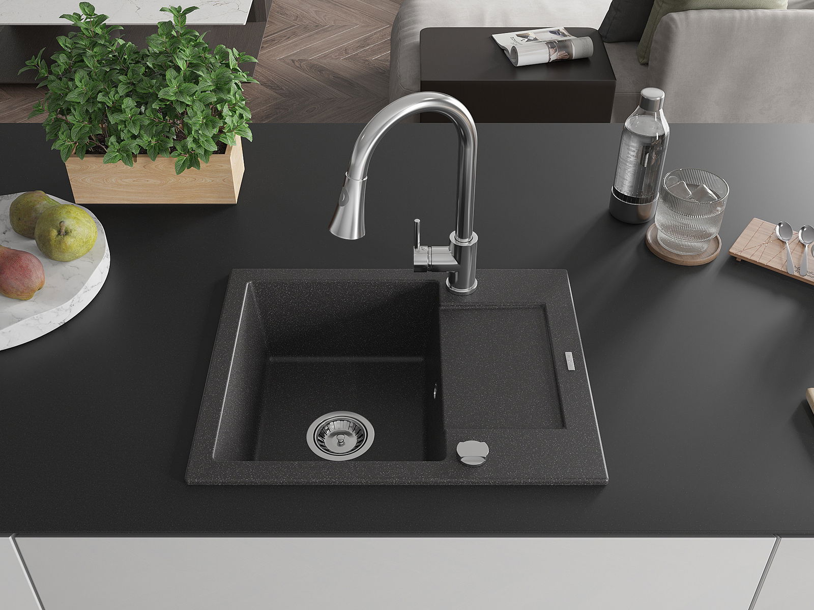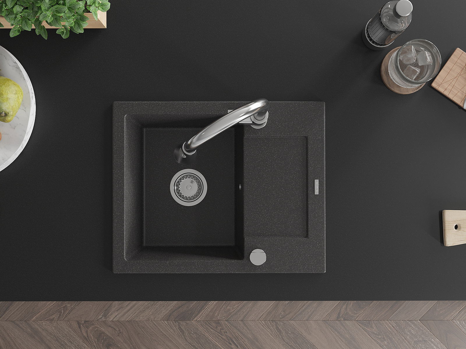 El fregadero está hecho de granito de alta calidad. Es un complemento elegante y, sobre todo, práctico para cualquier cocina, independientemente de su estilo. La alta calidad y durabilidad del granito aseguran un uso prolongado durante años.